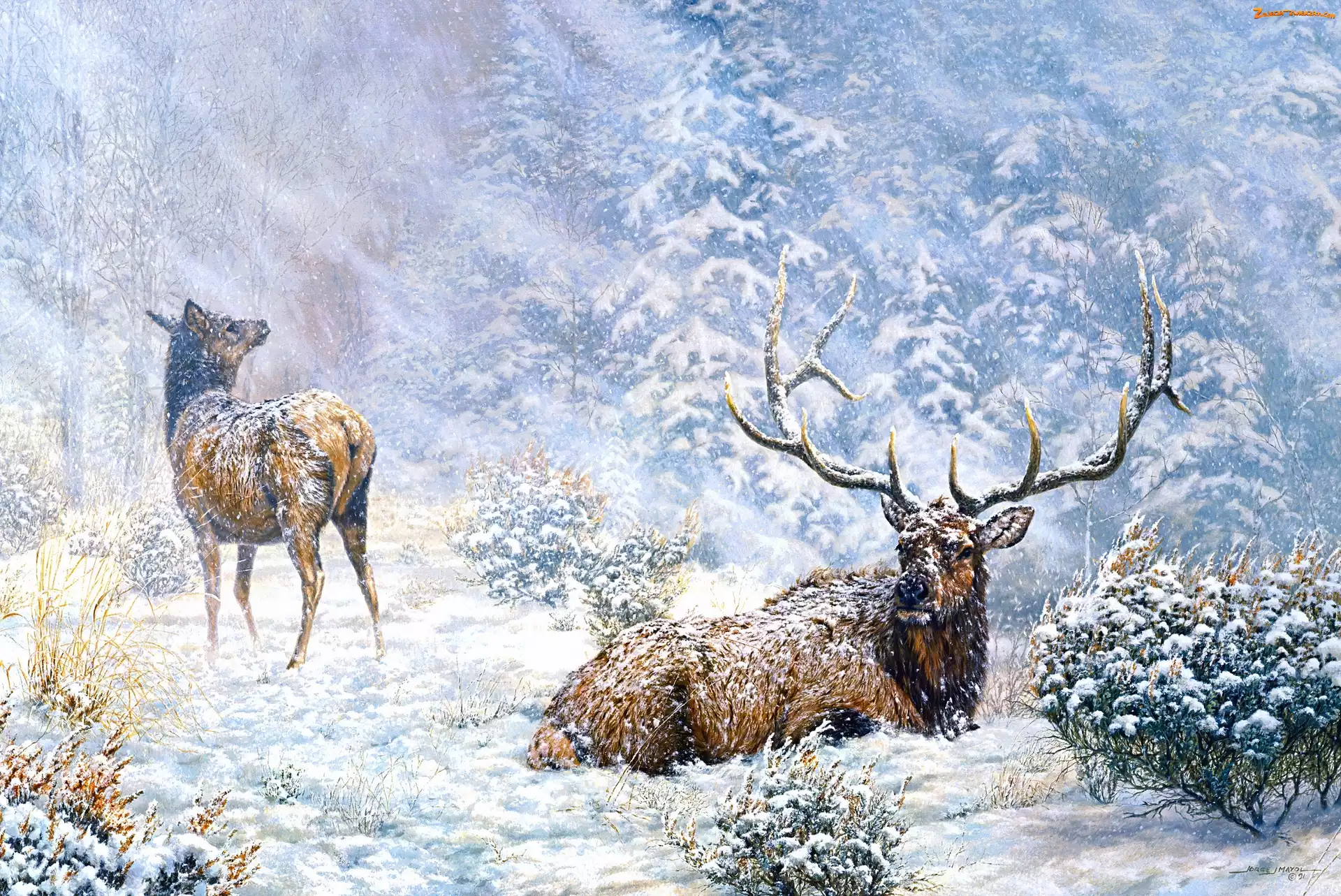 Zdjęcie: Jelenie, Las, Malarstwo, Zima, Śnieg, Jorge Mayol, Obraz, Drzewa