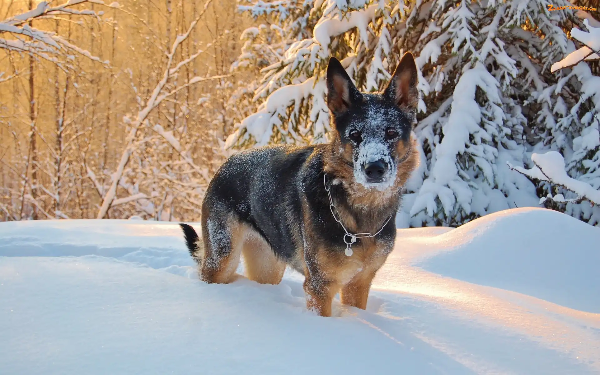 Drzewa, Zima, Owczarek niemiecki, Śnieg