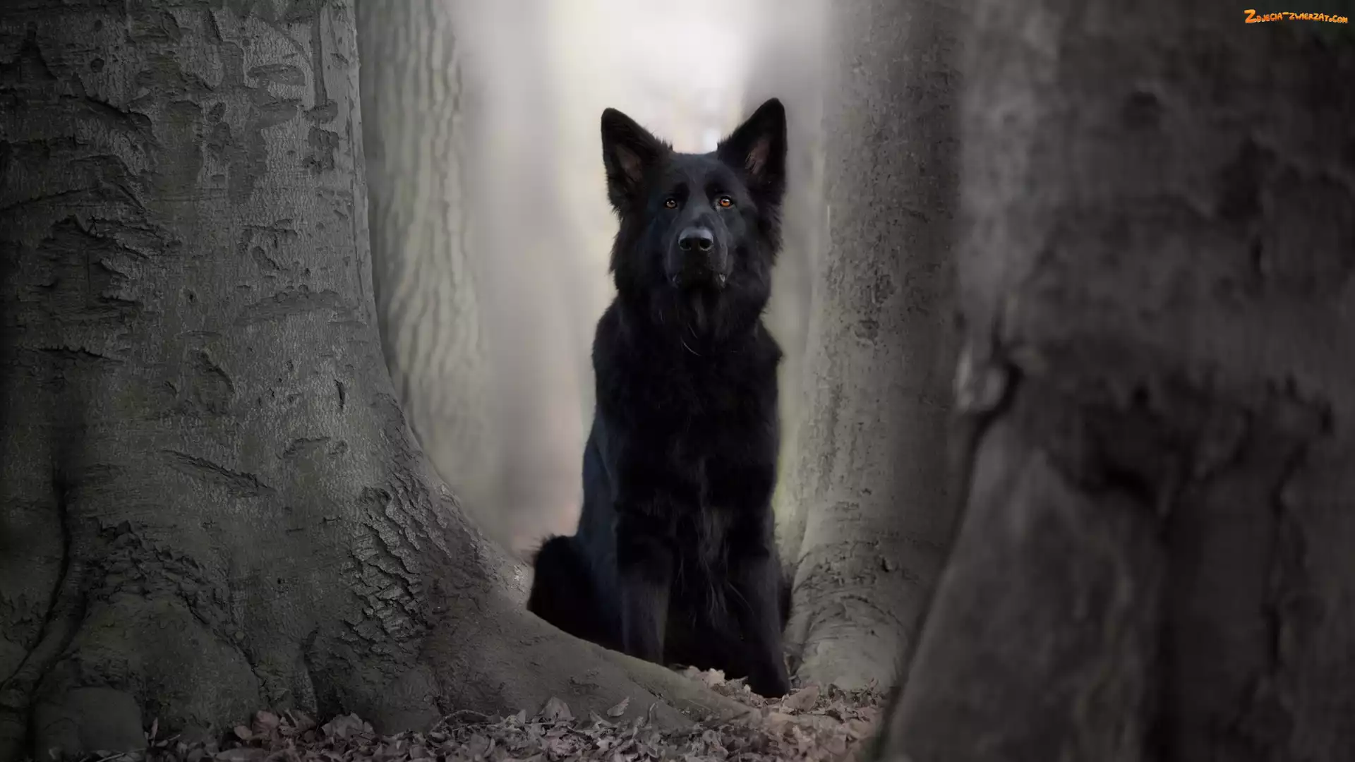 Zdjęcie: Drzewa, Pies, Czarny owczarek niemiecki
