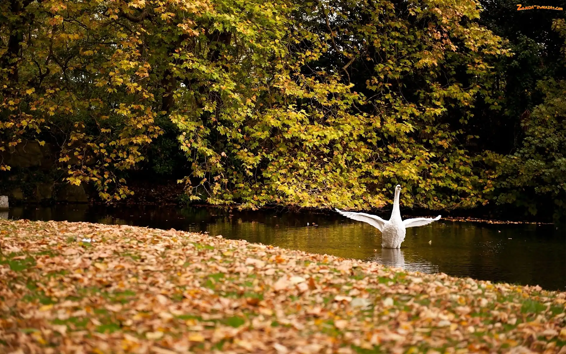 Zdjęcie: Łabędź, Rzeka, Opadłe, Drzewa, Liście