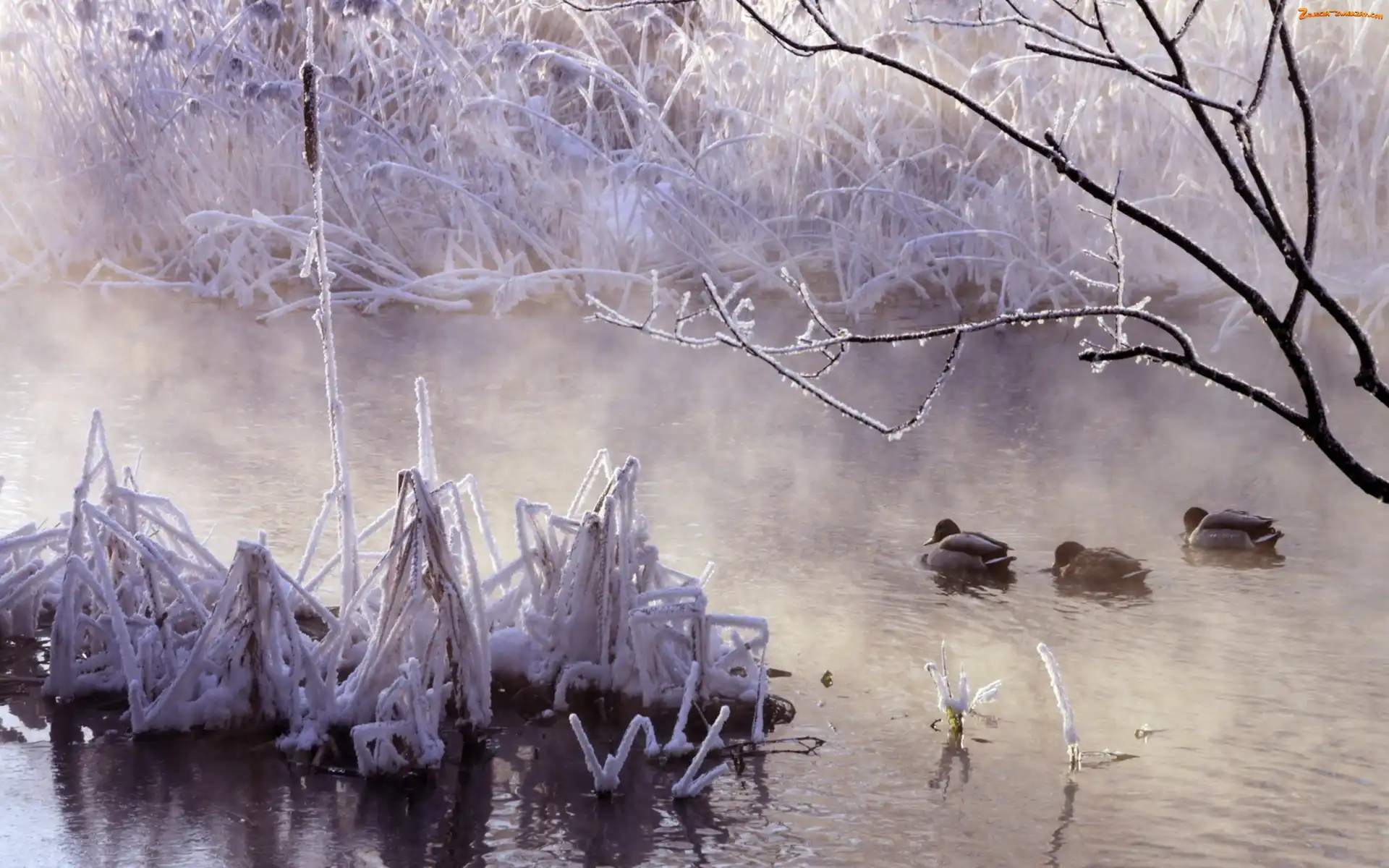 Drzewa, Zima, Rzeka, Kaczki