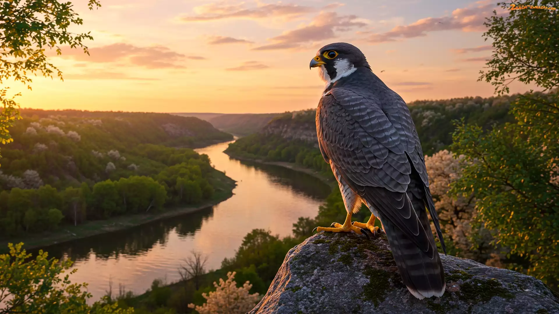 Zdjęcie: Drzewa, Las, Niebo, Ptak, Zachód słońca, Sokół, Rzeka, Kamień