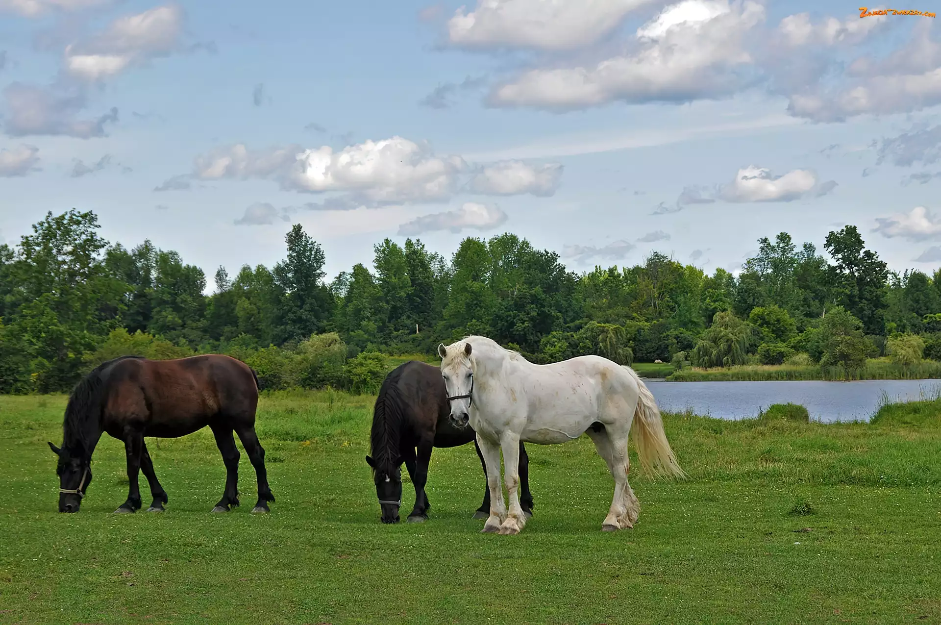 Zdjęcie: Drzewa, Rzeka, Konie, Trzy, Pastwisko