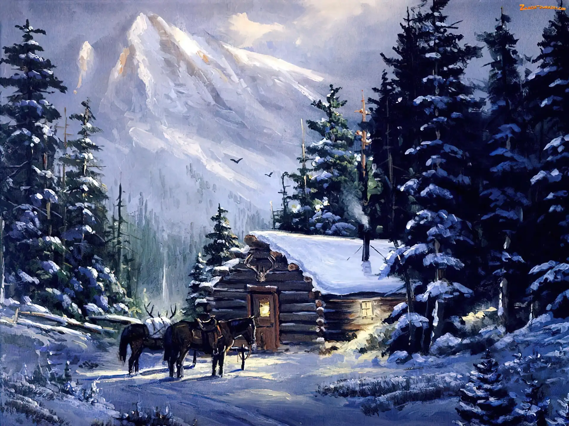 Zdjęcie: Drzewa, Góry, Konie, Zima, Dom