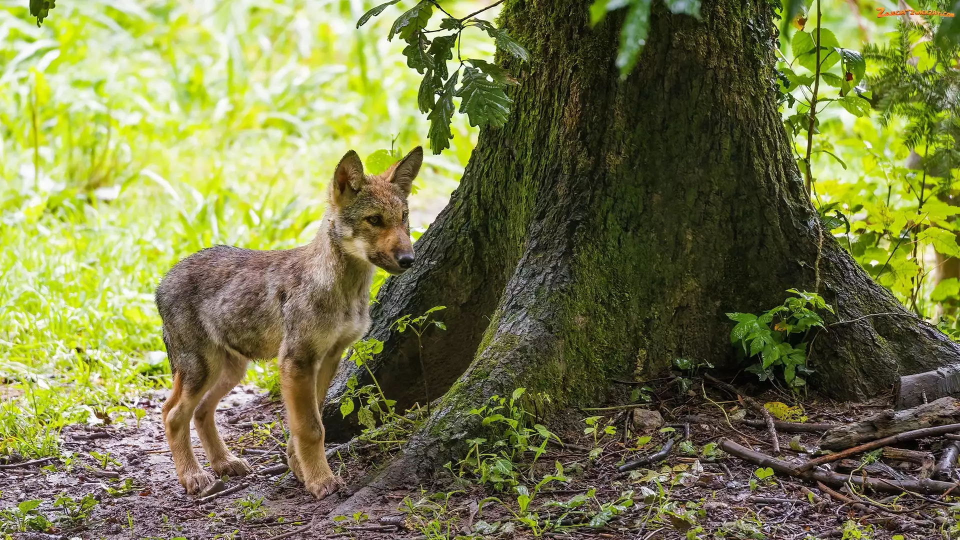 Zdjęcie: Młody, Wilk, Zbliżenie, Drzewo