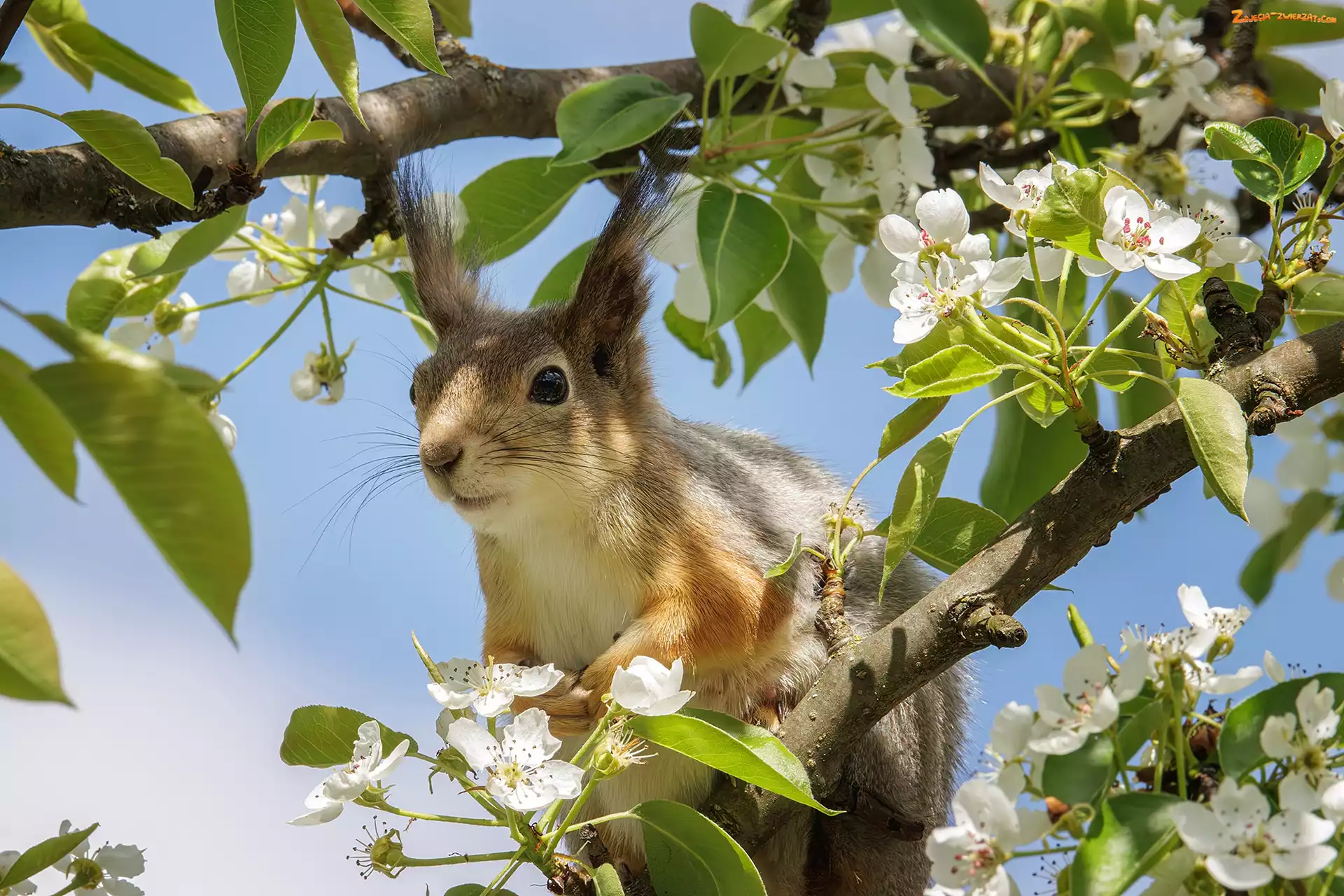 Zdjęcie: Wiewiórka, Drzewo owocowe, Kwiaty, Gałąź