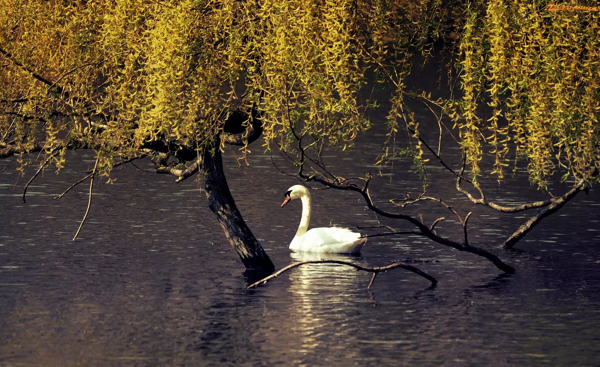 Drzewo, Łabędź, Biały, Staw, Ptak
