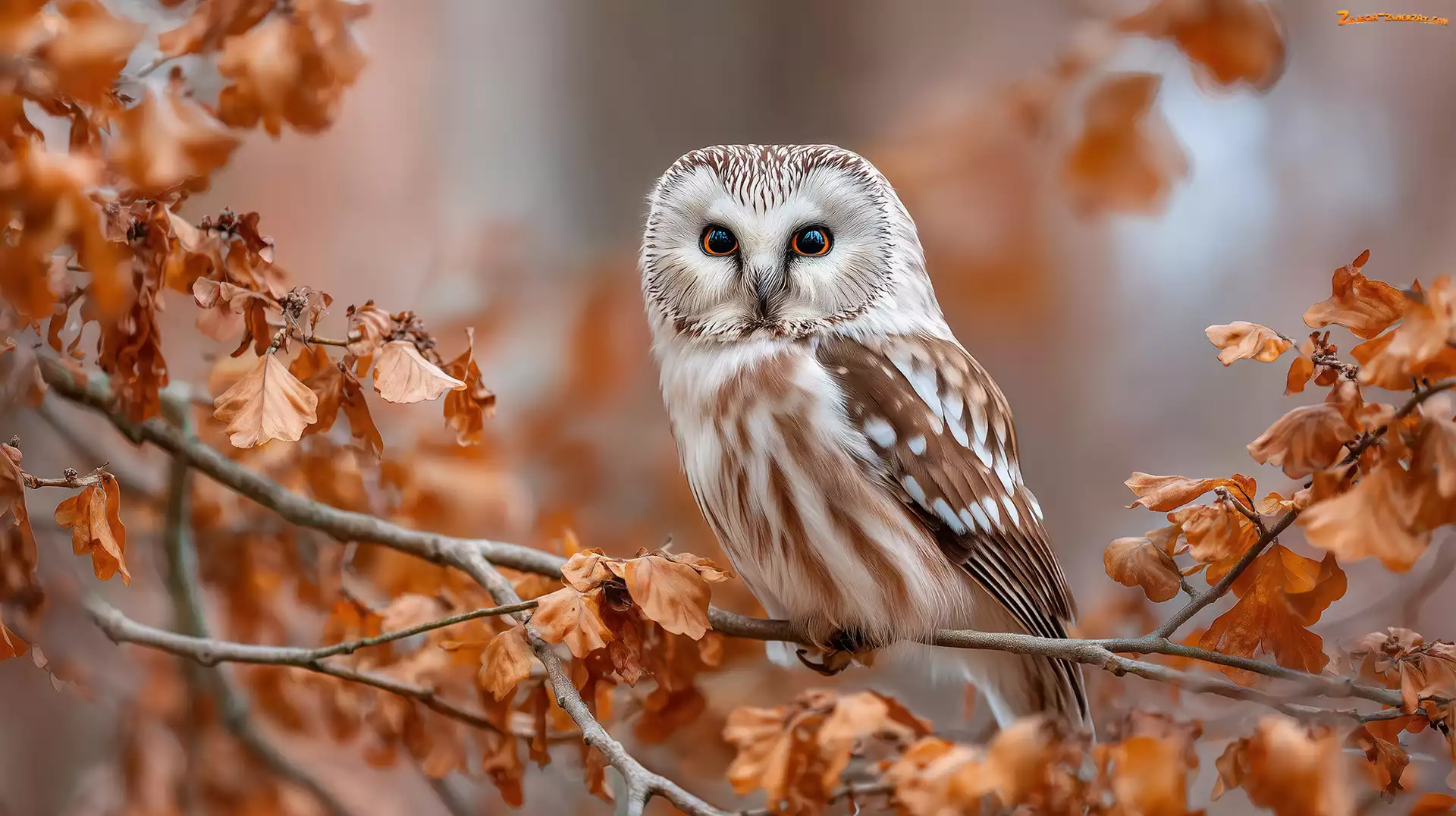 Zdjęcie: Drzewo, Liście, Ptak, Grafika, Sowa, AI, Gałęzie, Włochatka, Suche, Brązowe
