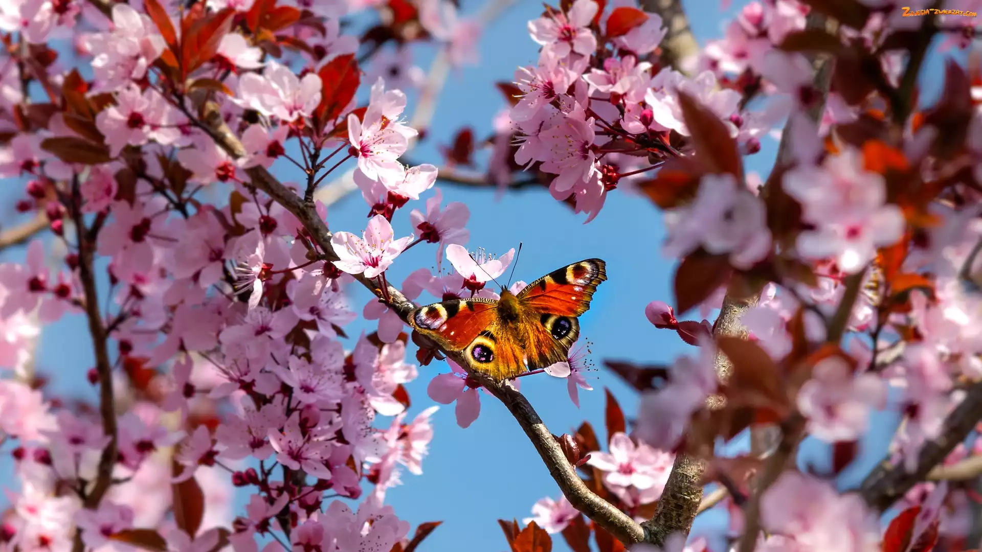 Zdjęcie: Kwitnąca, Drzewo owocowe, Rusałka pawik, Motyl, Gałązki, Wiśnia