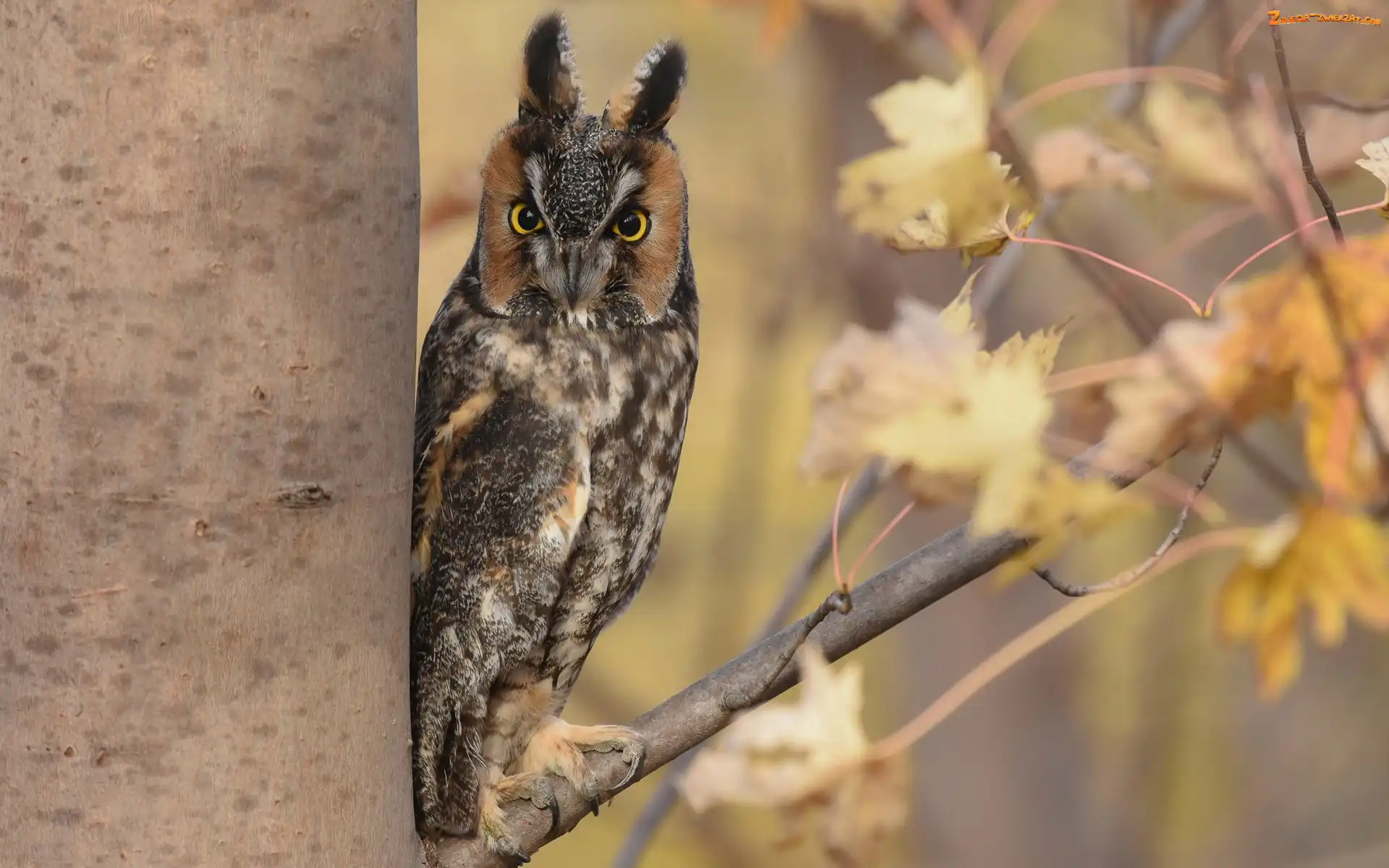 Zdjęcie: Jesień, Uszatka zwyczajna, Ptak, Gałąź, Liście, Sowa uszata, Drzewo