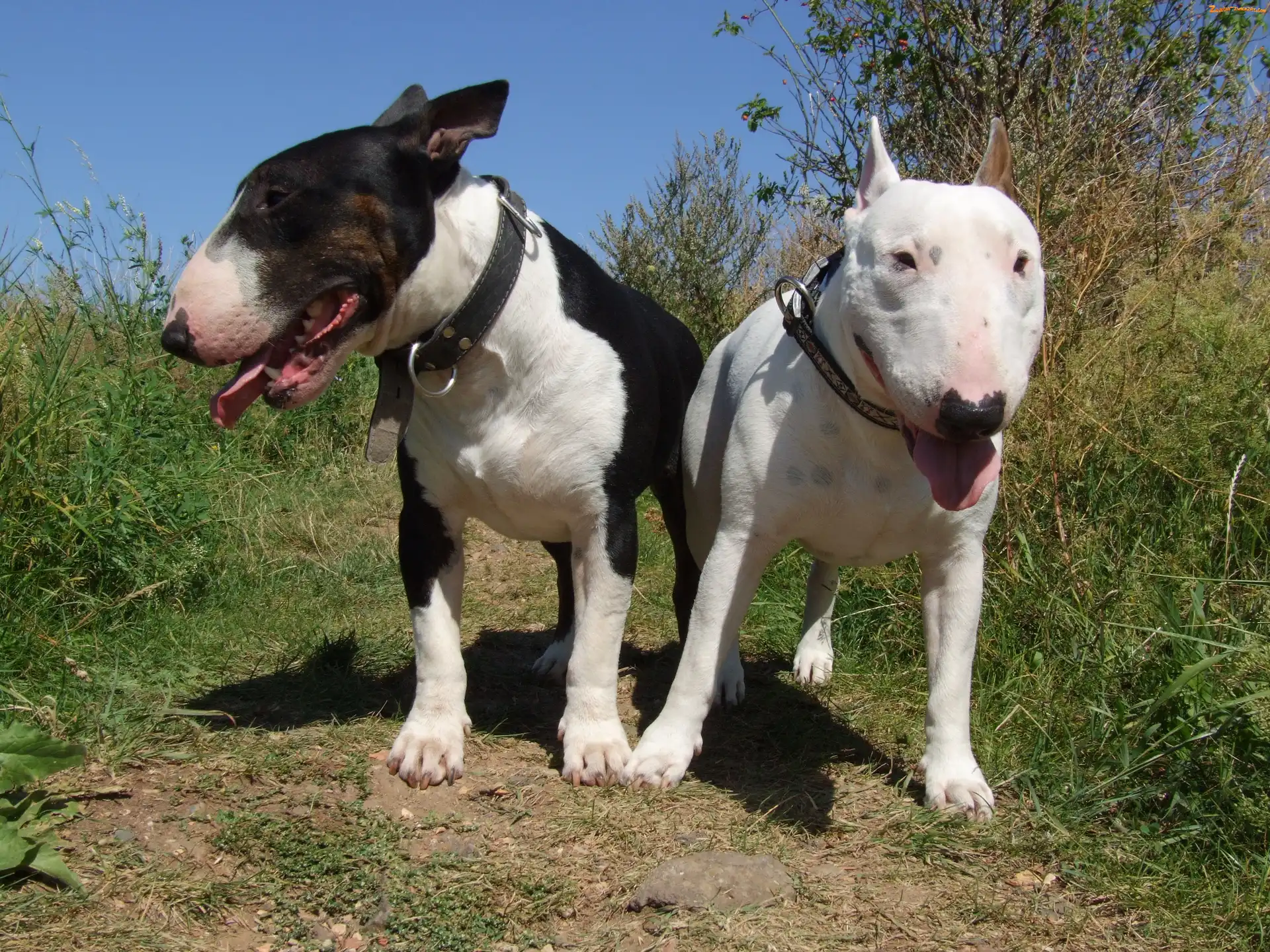 Dwa, Bulteriery Obroża, Biały, Bulterier Biały, Bullterier Dywan, Pies, Bulterier Łata, Język, Bulterier, Biały, Głowa Bulteriery Pies, Bulterier Bulterier, Kwiaty Zabawa, Obroża, Łata, Bulterier, Język Bulterier, Ścieżka, Pies, Kwiaty Łata, Trawa, Bulterier, Obroża Las, Ściółka, Bulterier, Pies, Pień Kłoda, Pień, Bulterier, Pies, Skok Biały, Bulterier