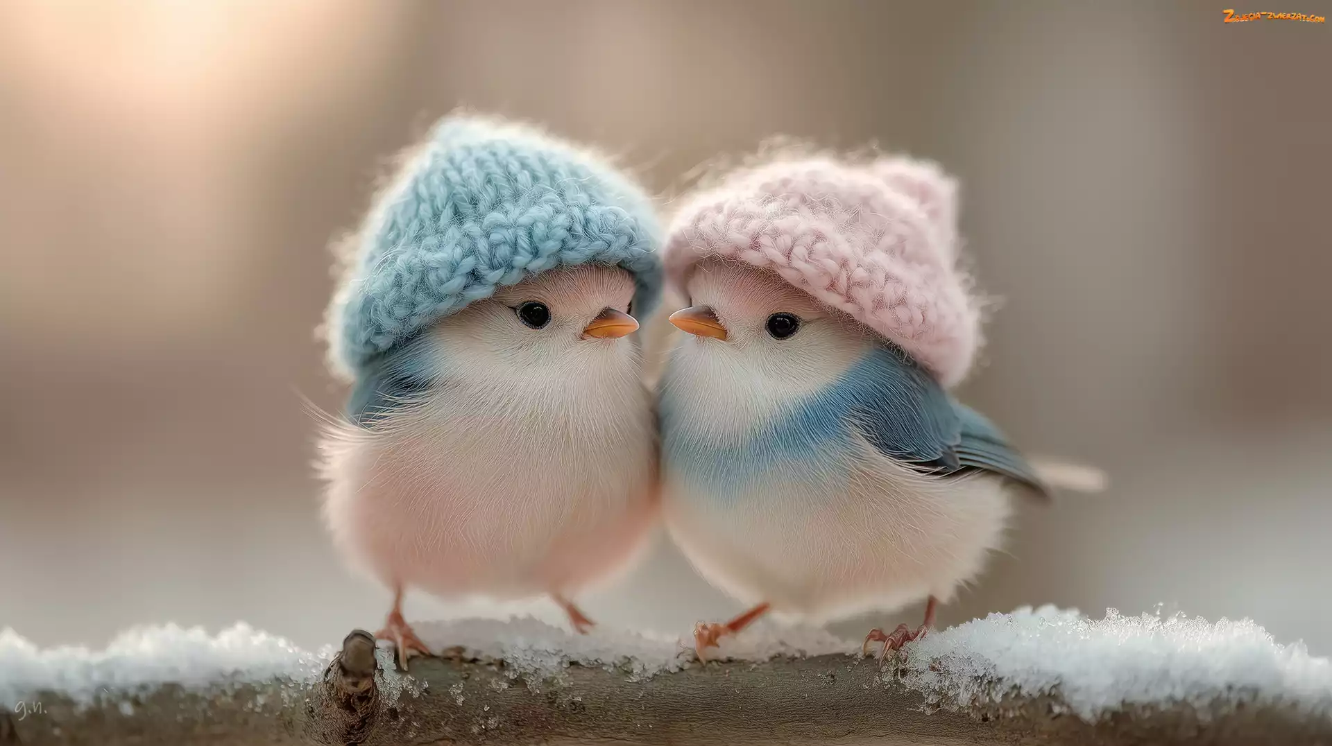 Zdjęcie: Grafika AI, Czapki, Dwa, Ptaki, Gałąź, Śnieg