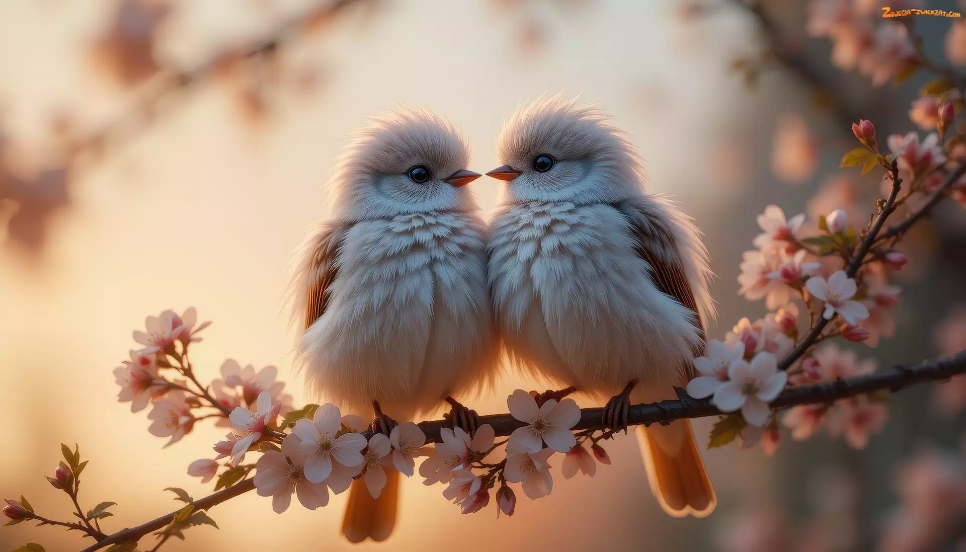 Zdjęcie: Grafika, Ptaki, Młode, Dwa, Kwiaty, Gałązka