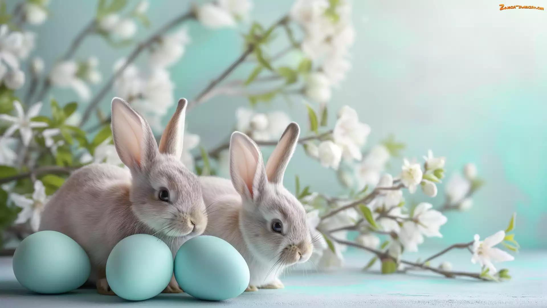 Zdjęcie: Kwiaty, Króliki, Wielkanoc, Dwa, Pisanki, Gałązki