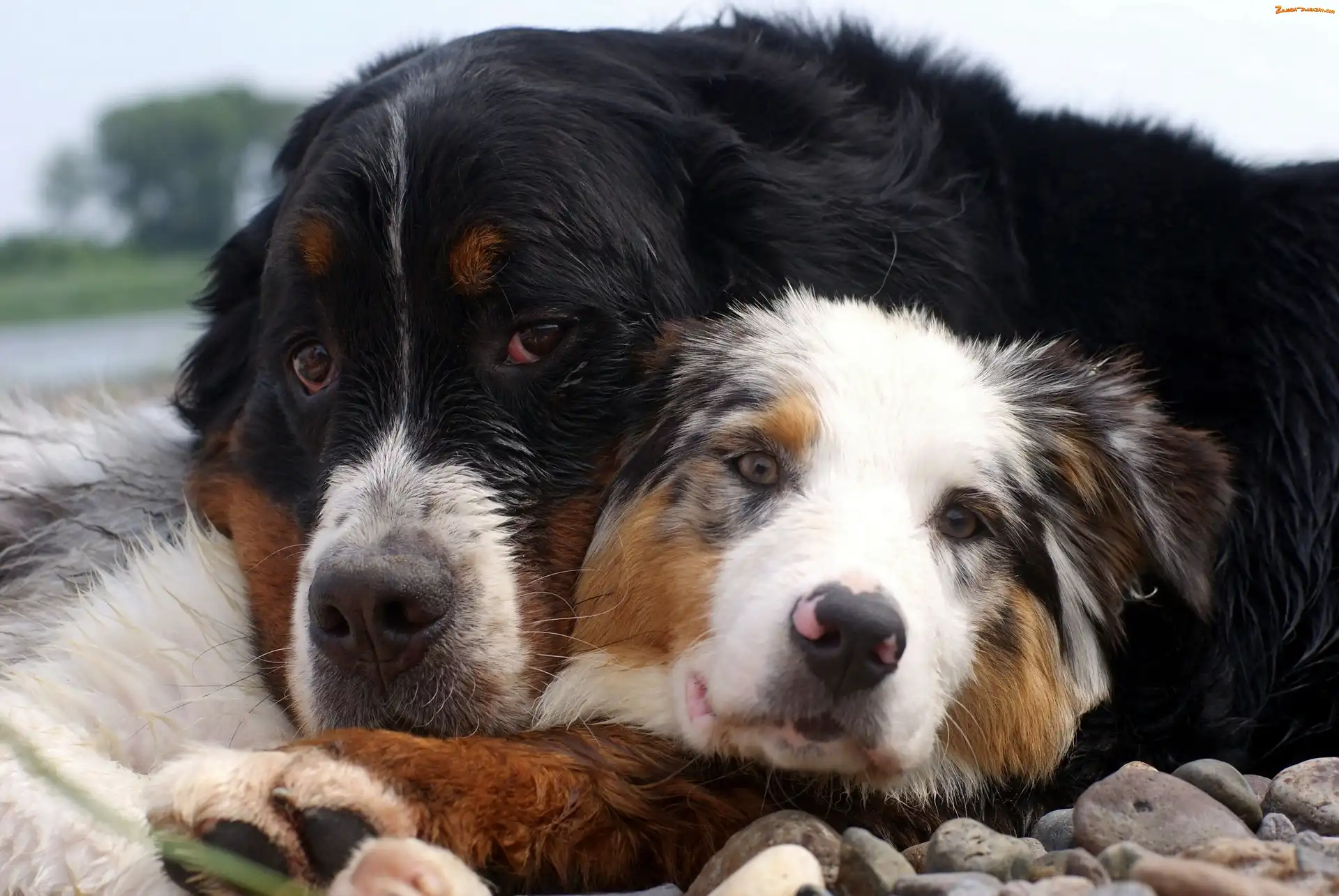 Zdjęcie: Owczarek australijski, Berneński Pies Pasterski, Psy, Dwa, Kamienie