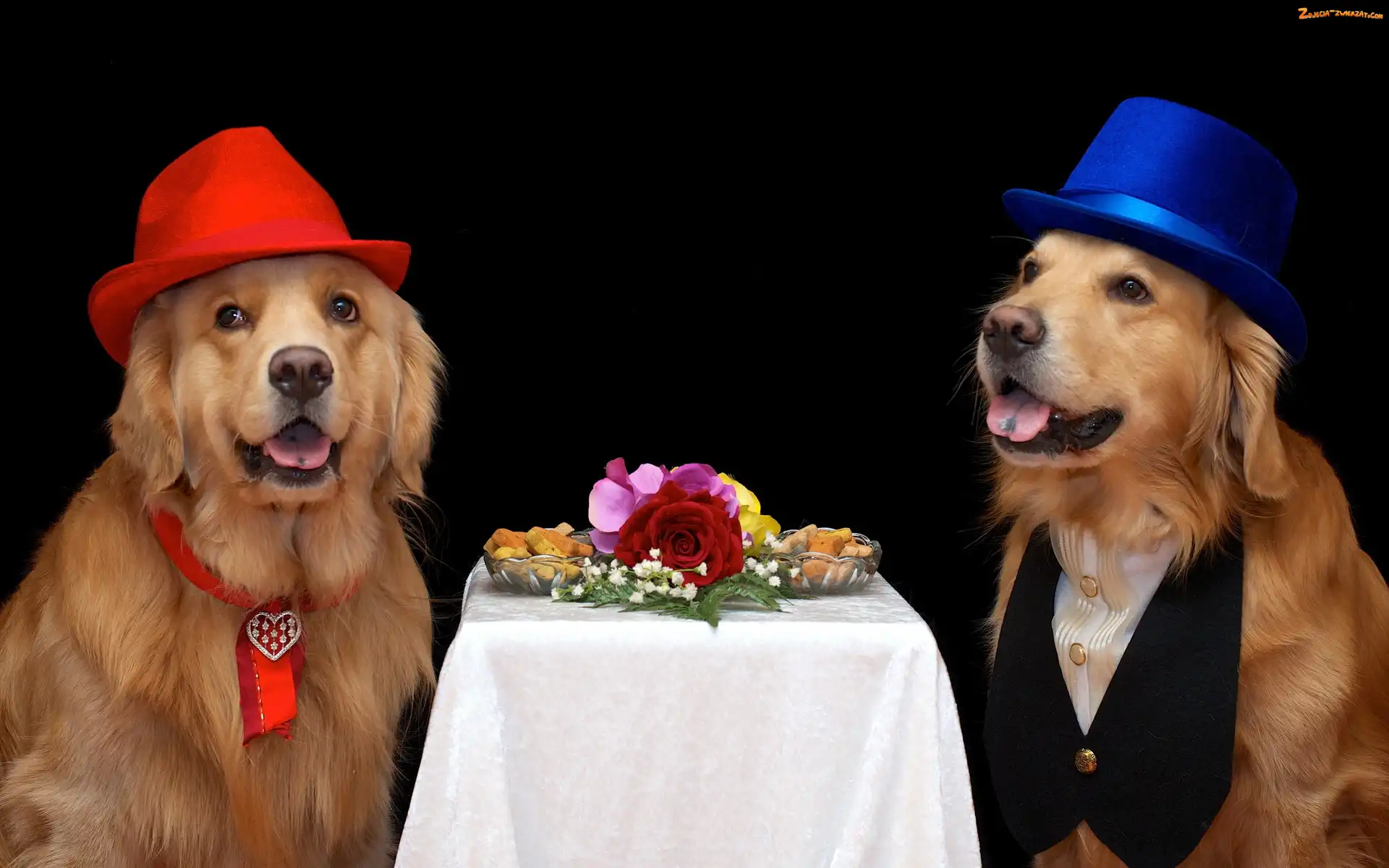 Zdjęcie: Psy, Kapelusze, Dwa, Golden retriever