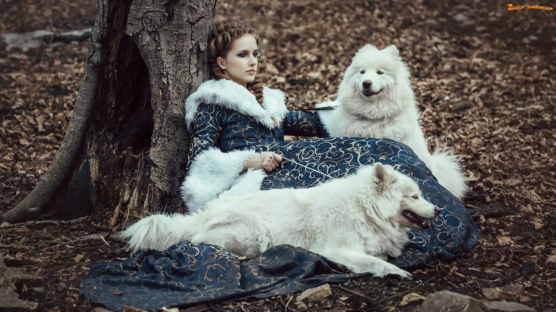 Zdjęcie: Dwa, Samojedy, Kobieta, Psy