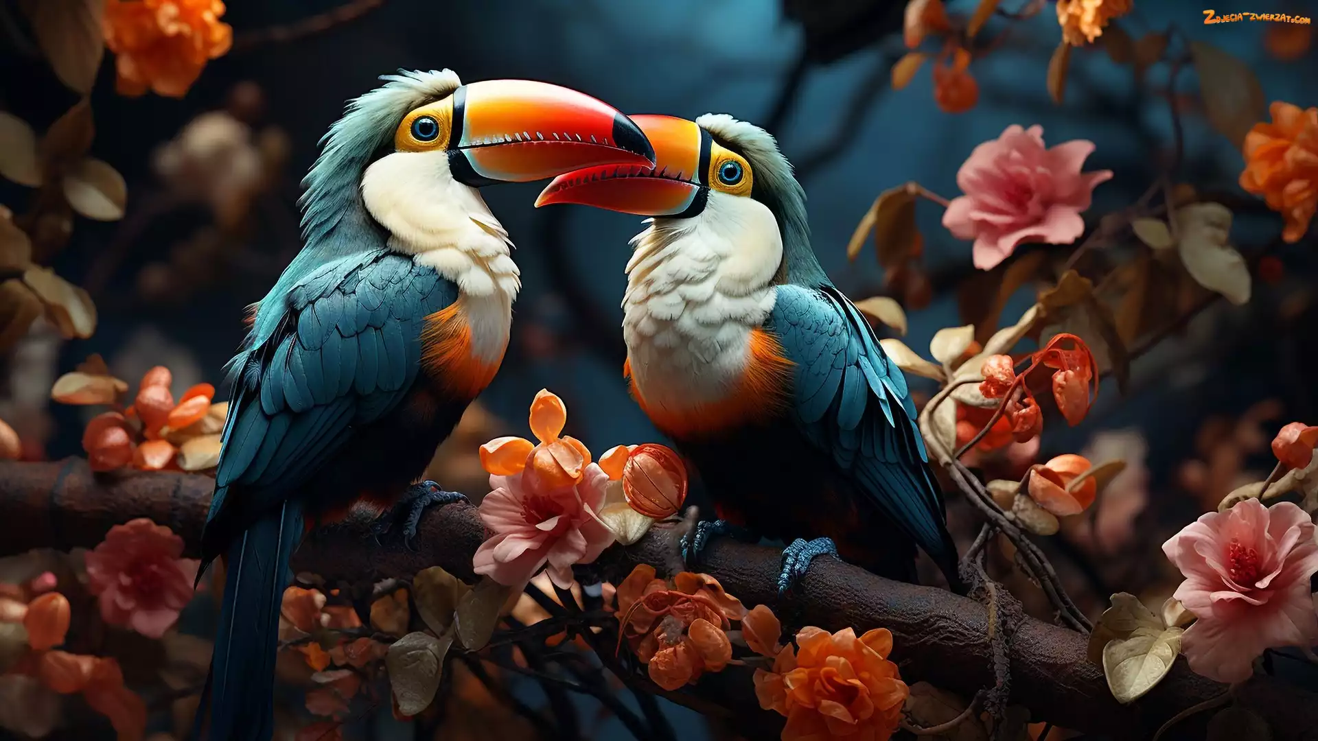 Zdjęcie: Konar, Tukany, Ptaki, Dwa, Różowe, Kwiaty