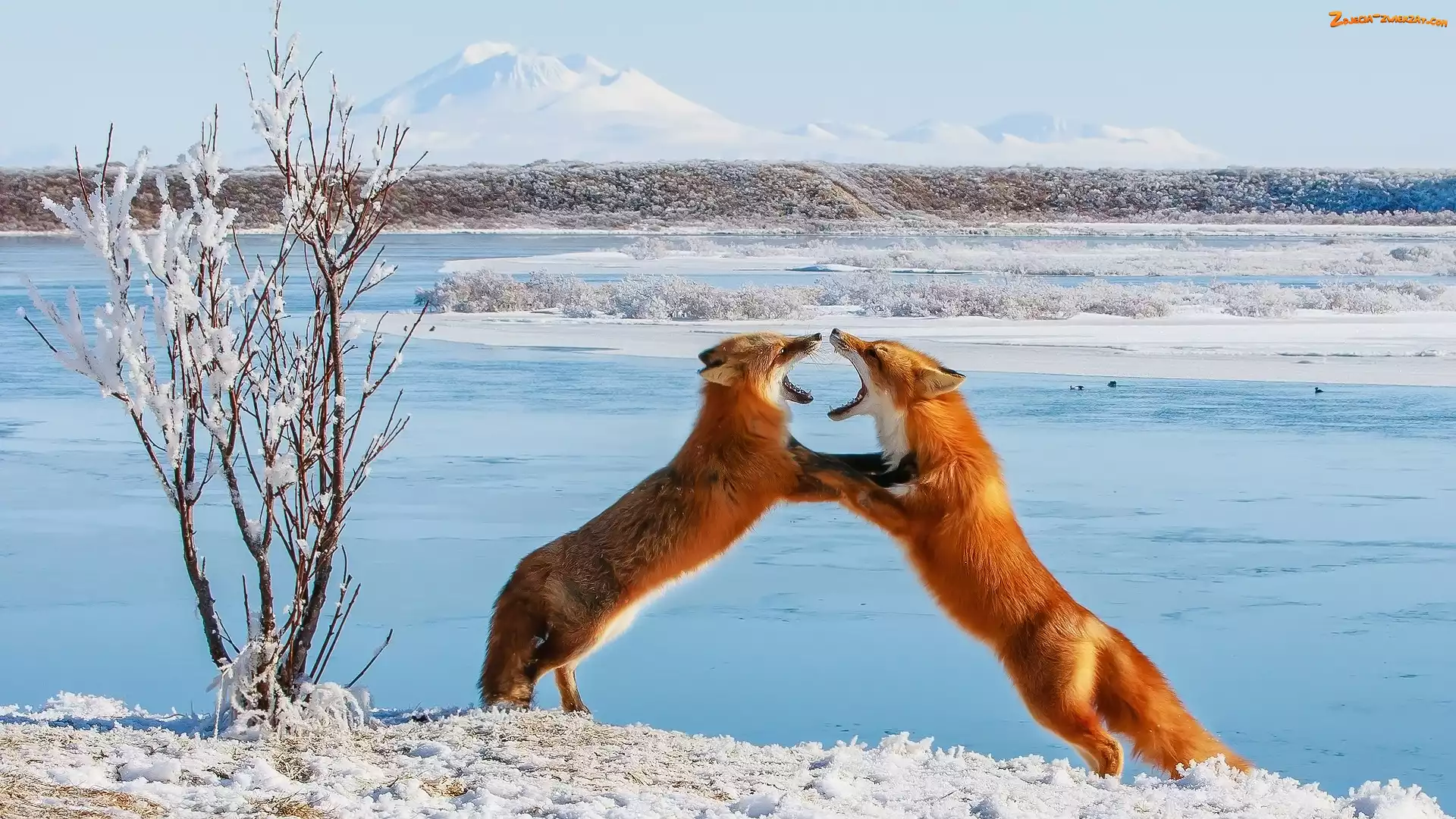 Zdjęcie: Dwa, Zima, Zabawa, Lisy, Śnieg, Rude