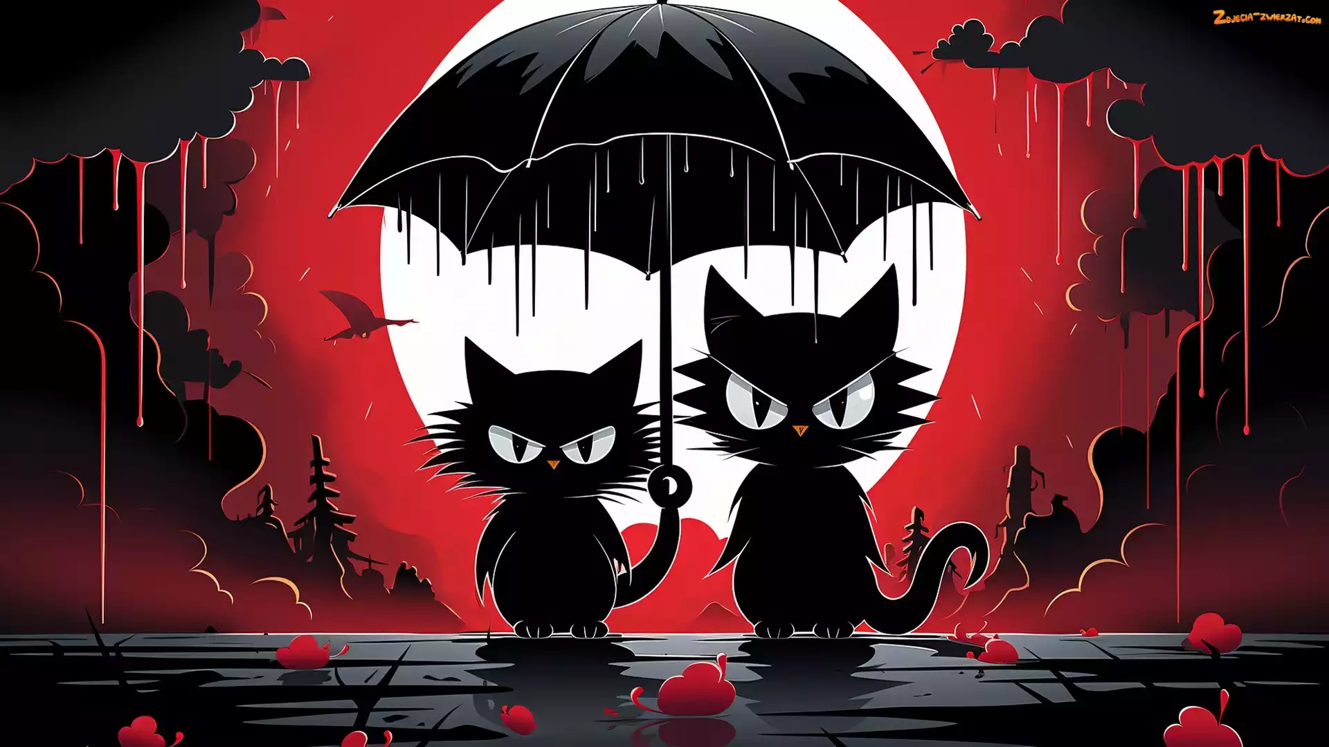 Zdjęcie: Deszcz, Koty, Grafika, Dwa, Parasolka, Padający