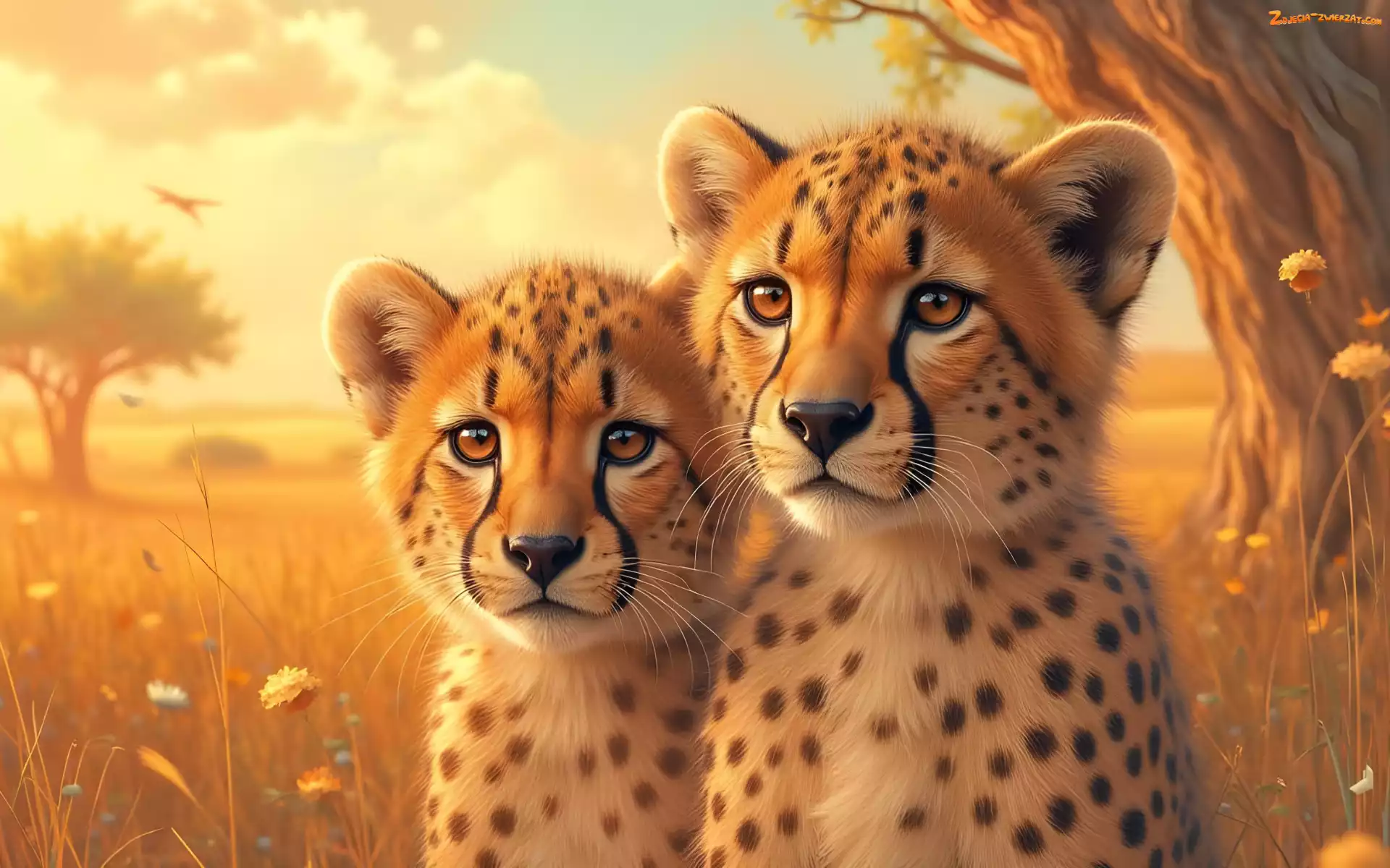 Zdjęcie: Grafika, Drzewa, Gepardy, Dwa, Chmury, Rośliny