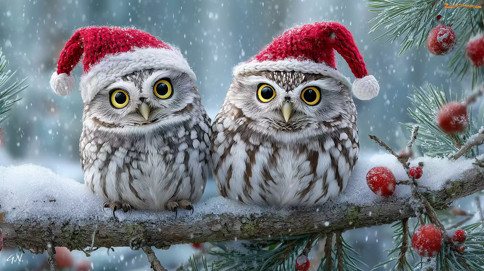 Zdjęcie: Grafika AI, Czapki, Dwie, Sowy, Gałązki, Zima