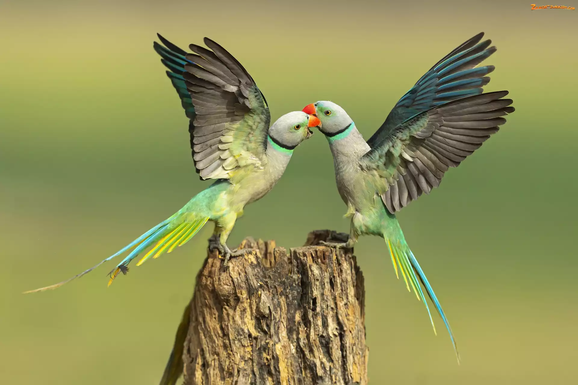 Zdjęcie: Pniak, Papugi, Ptaki, Dwie, Aleksandretty seledynowe, Drzewo