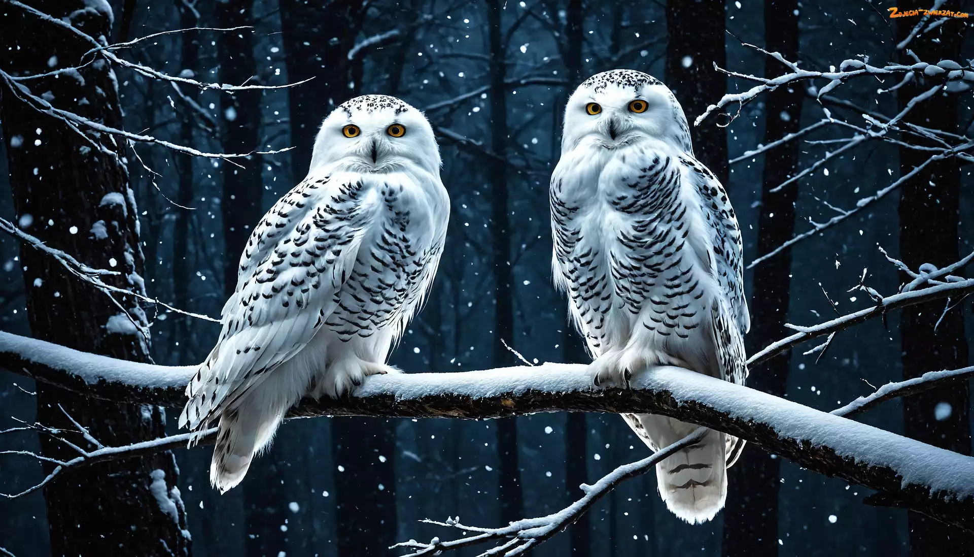 Zdjęcie: Gałąź, Zima, Noc, Dwie, Sowy śnieżne