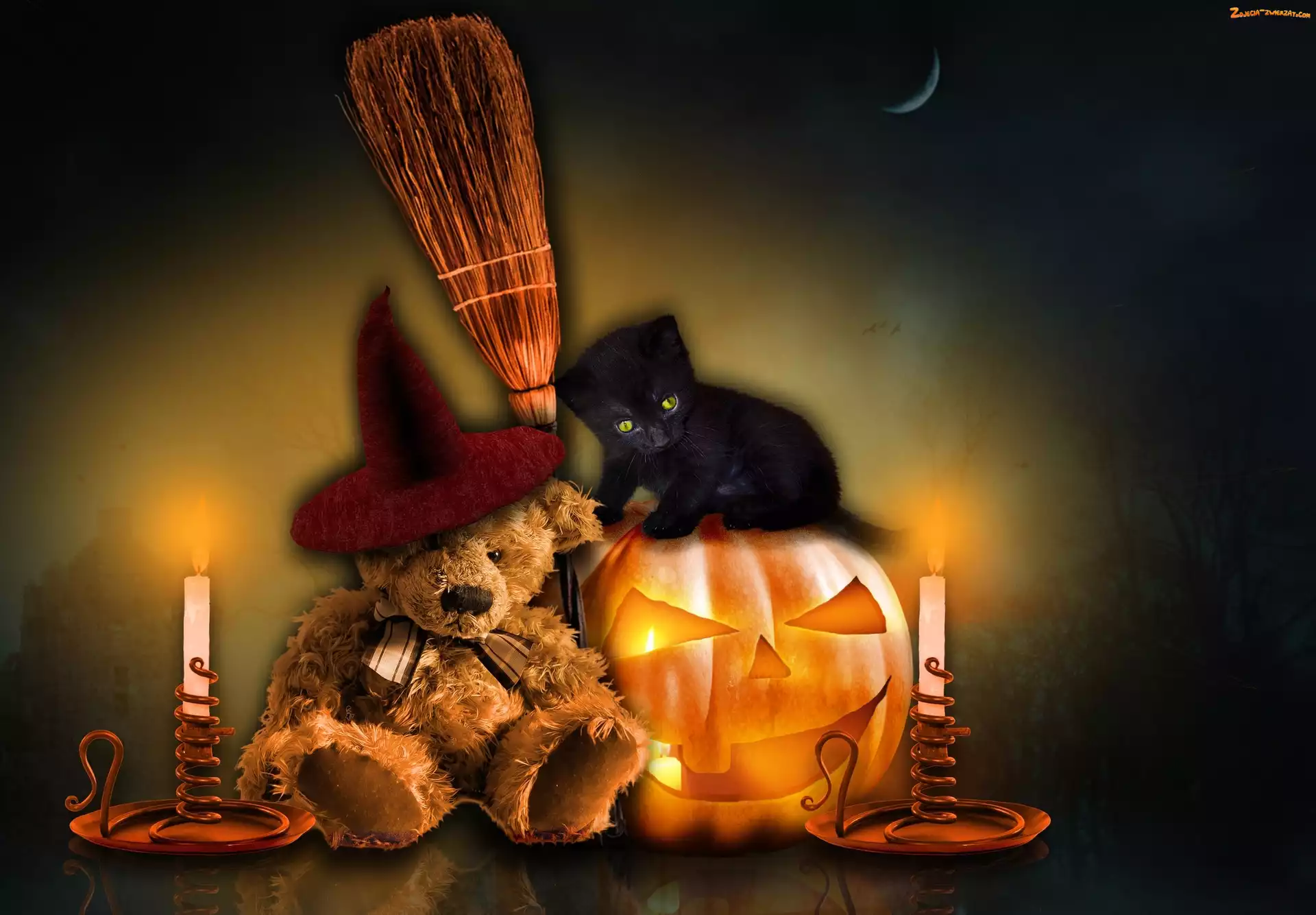 Zdjęcie: Dynia, Świece, Kot, Halloween, Miś