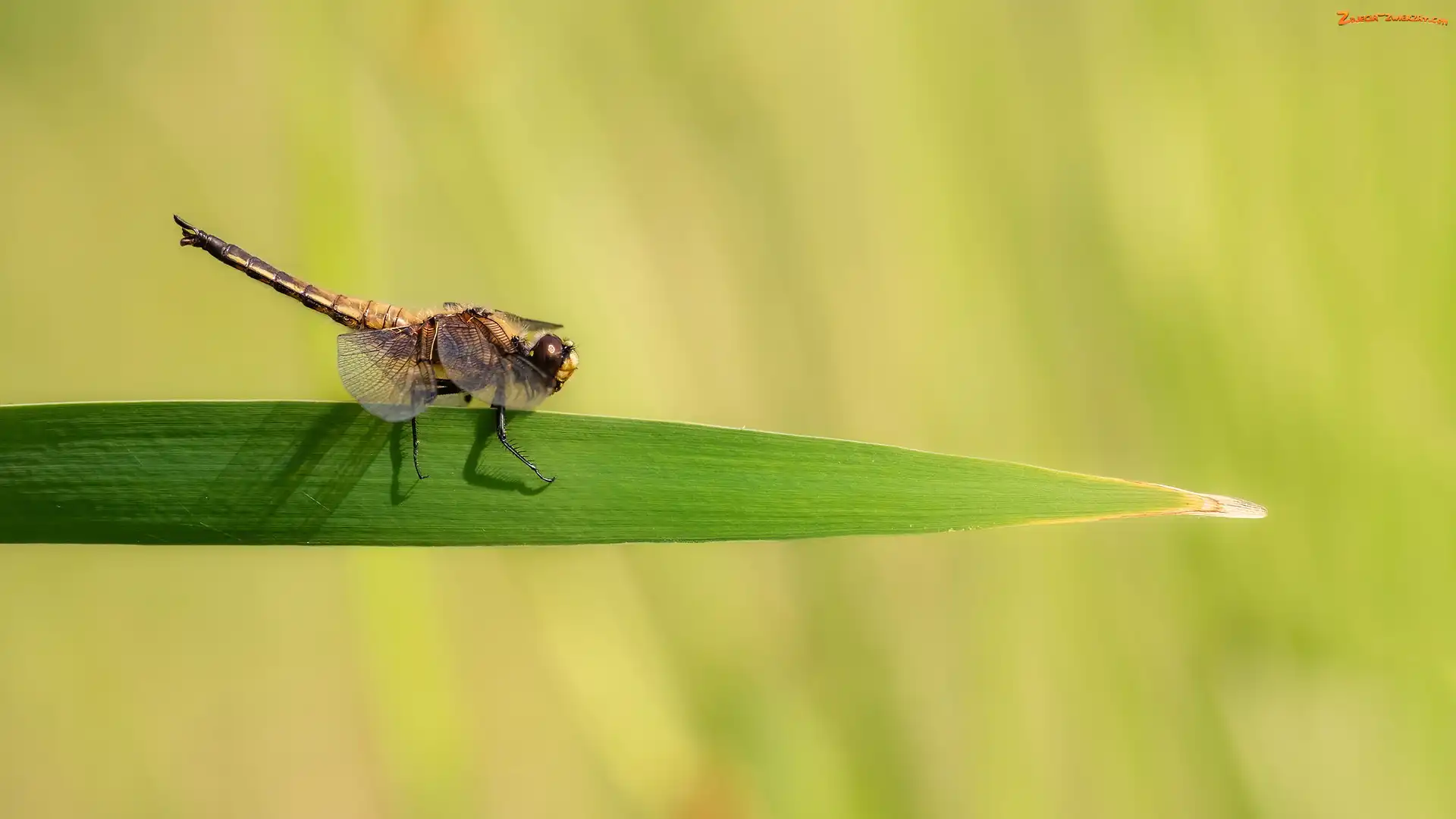 Zbliżenie, Źdźbło, Libellula quadrimaculata, Ważka czteroplama, Trawa
