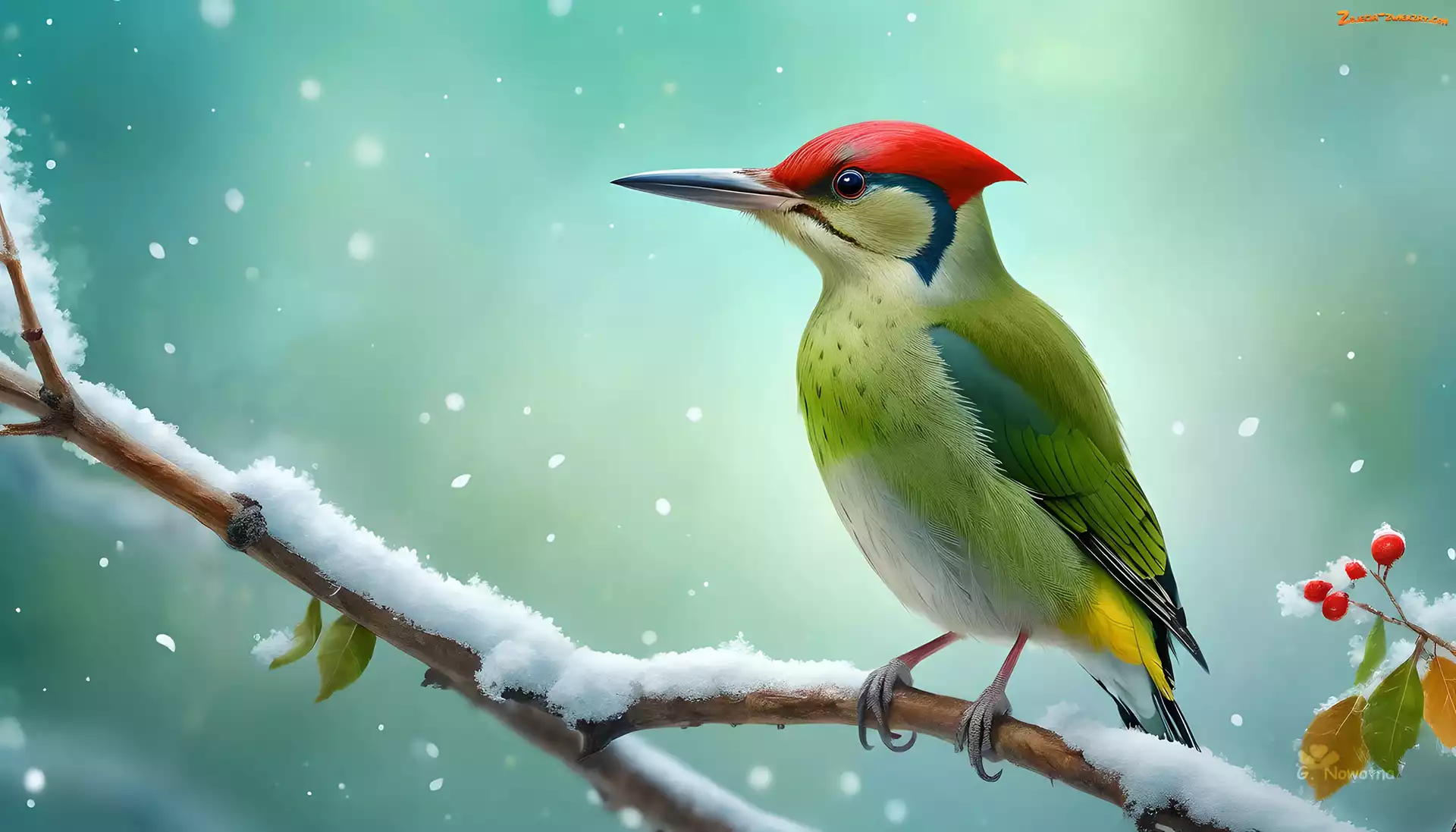 Zdjęcie: Gałąź, Ośnieżona, Grafika, Dzięcioł zielony, Ptak