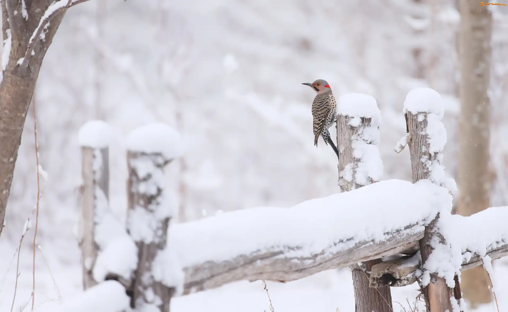 Zdjęcie: Ogrodzenie, Zima, Ptak, Dzięcioł różowoszyi, Śnieg, Drewniane