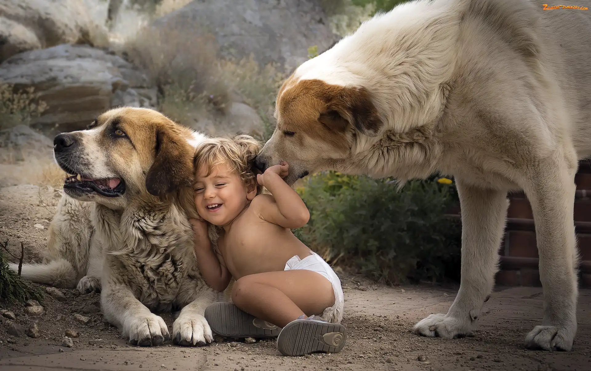 Zdjęcie: Dziecko, Owczarek środkowoazjatycki, Psy, Zabawa