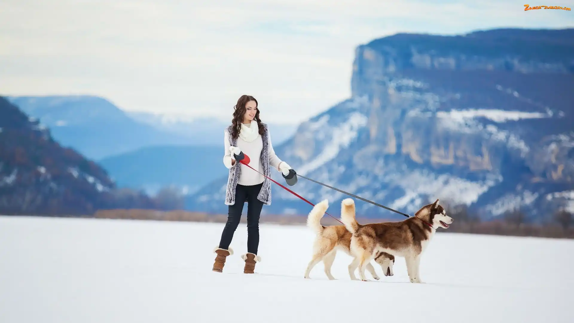 Zdjęcie: Psy, Dziewczyna, Zima, Góry, Dwa, Siberian husky