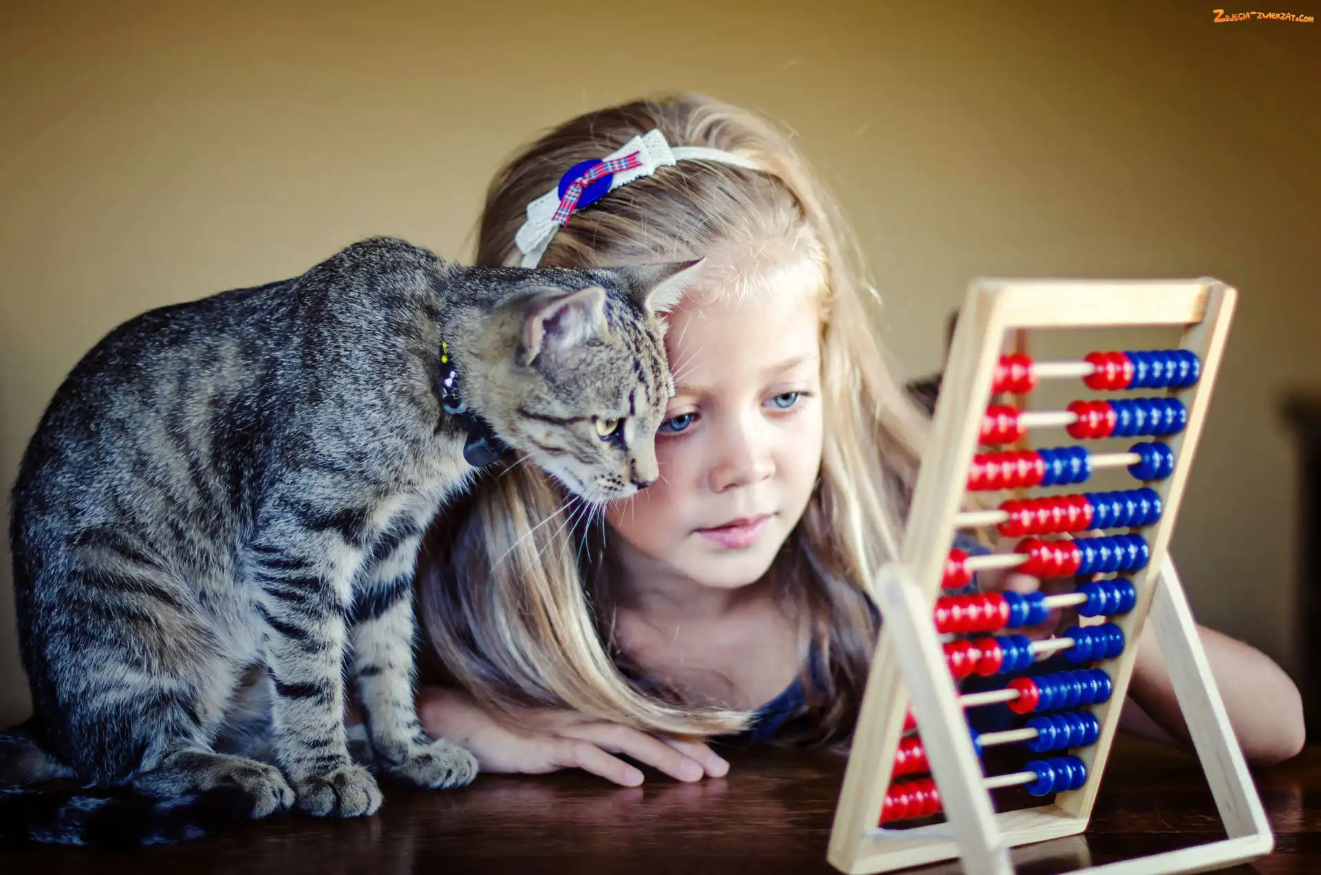 Zdjęcie: Dziewczynka, Liczydło, Dziecko, Kot