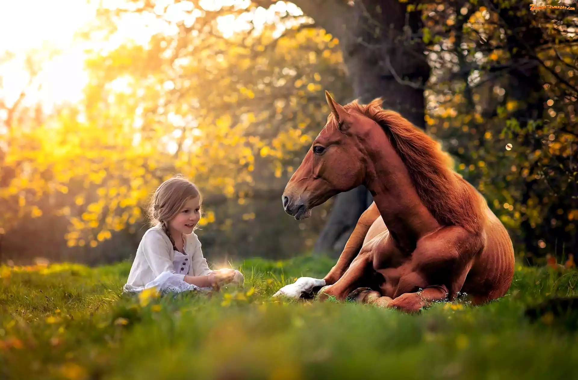 Zdjęcie: Dziewczynka, Drzewo, Koń, Łąka