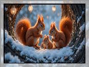 Zdjęcie: AI, Zima, Wiewiórki, Dziupla, Śnieg, Lampiony