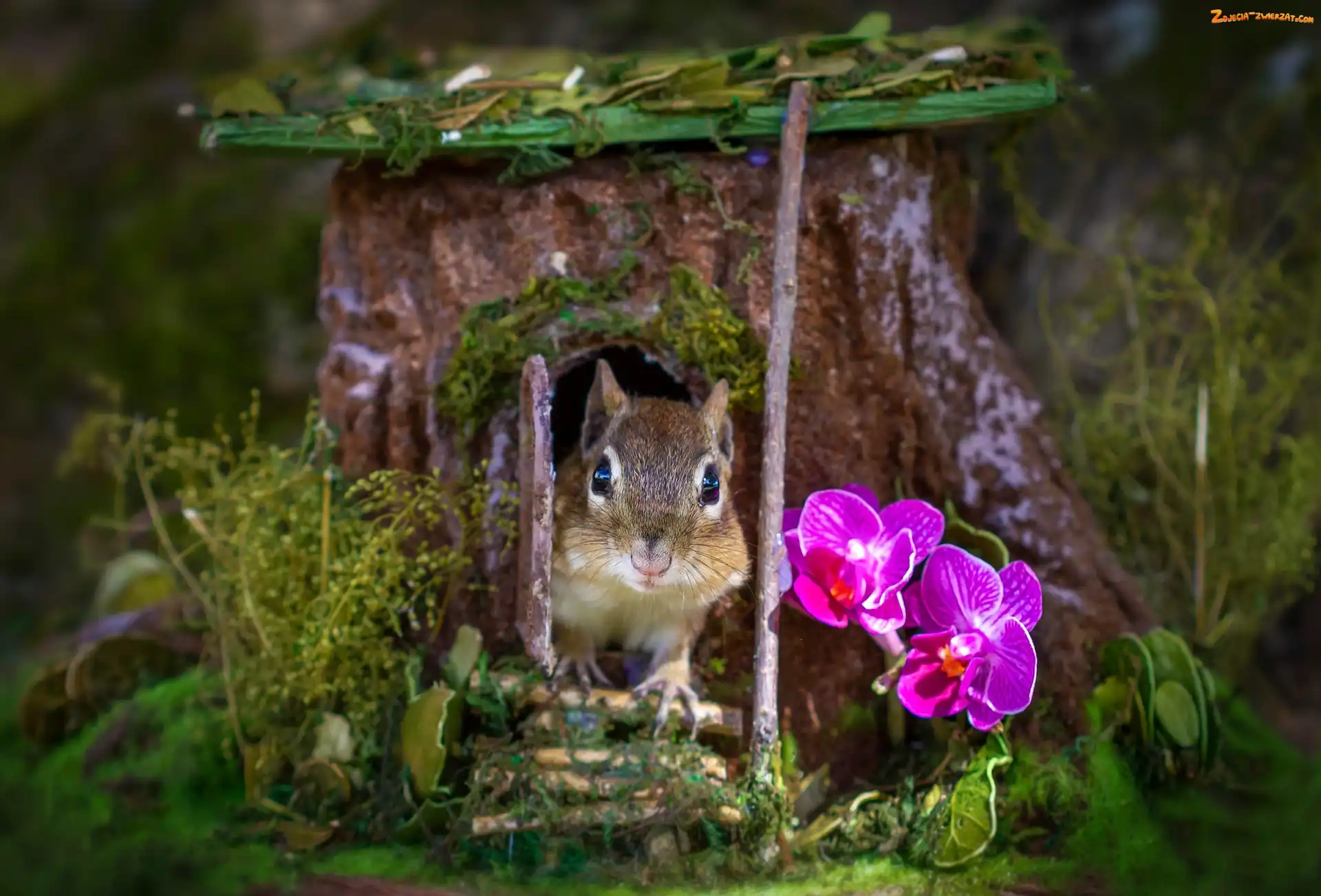 Zdjęcie: Trawa, Dziupla, Pień, Kwiaty, Storczyki, Drzewo, Wiewiórka