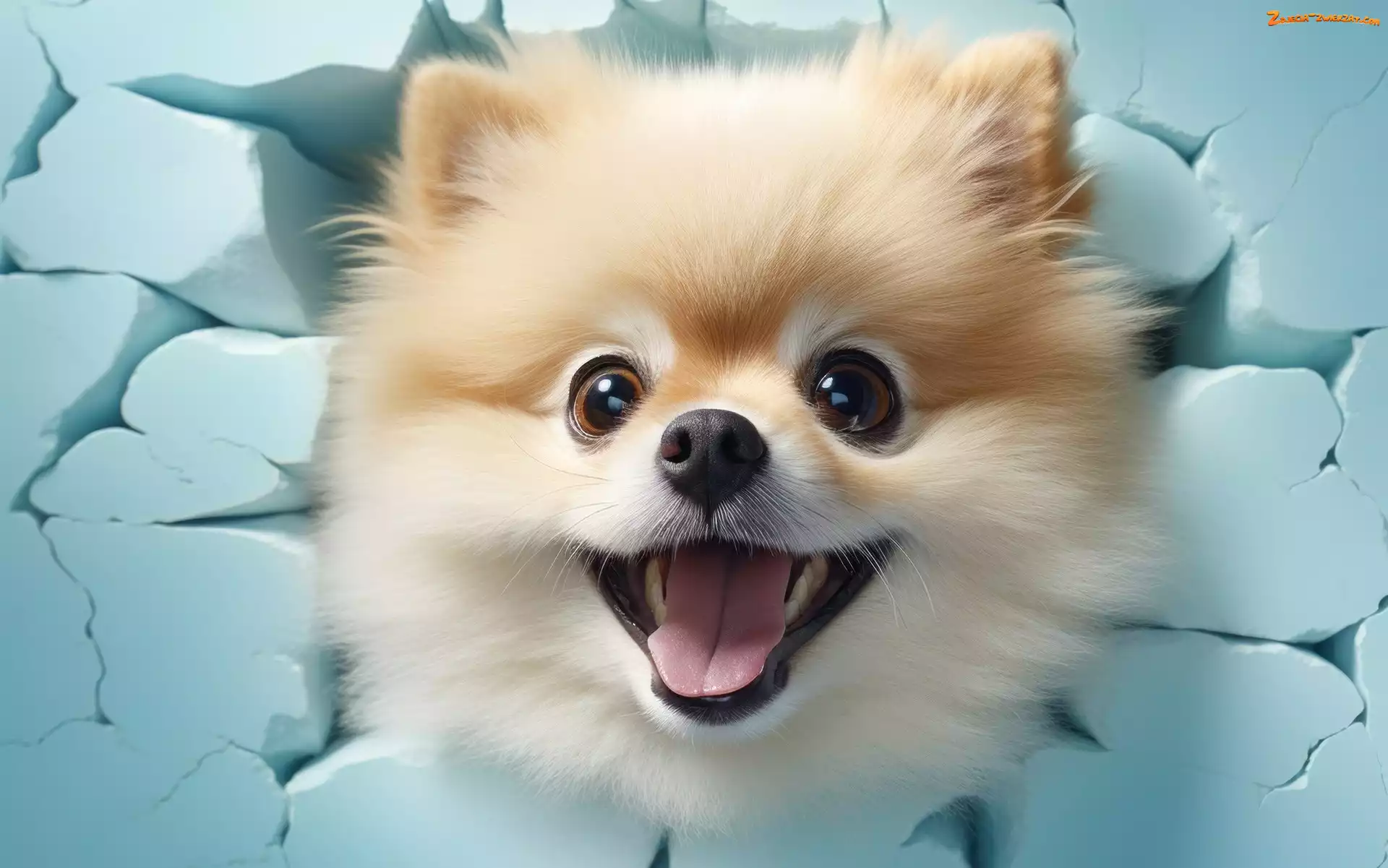 Zdjęcie: Ściana, Szpic miniaturowy, Dziura, Brązowo-biały, Pies
