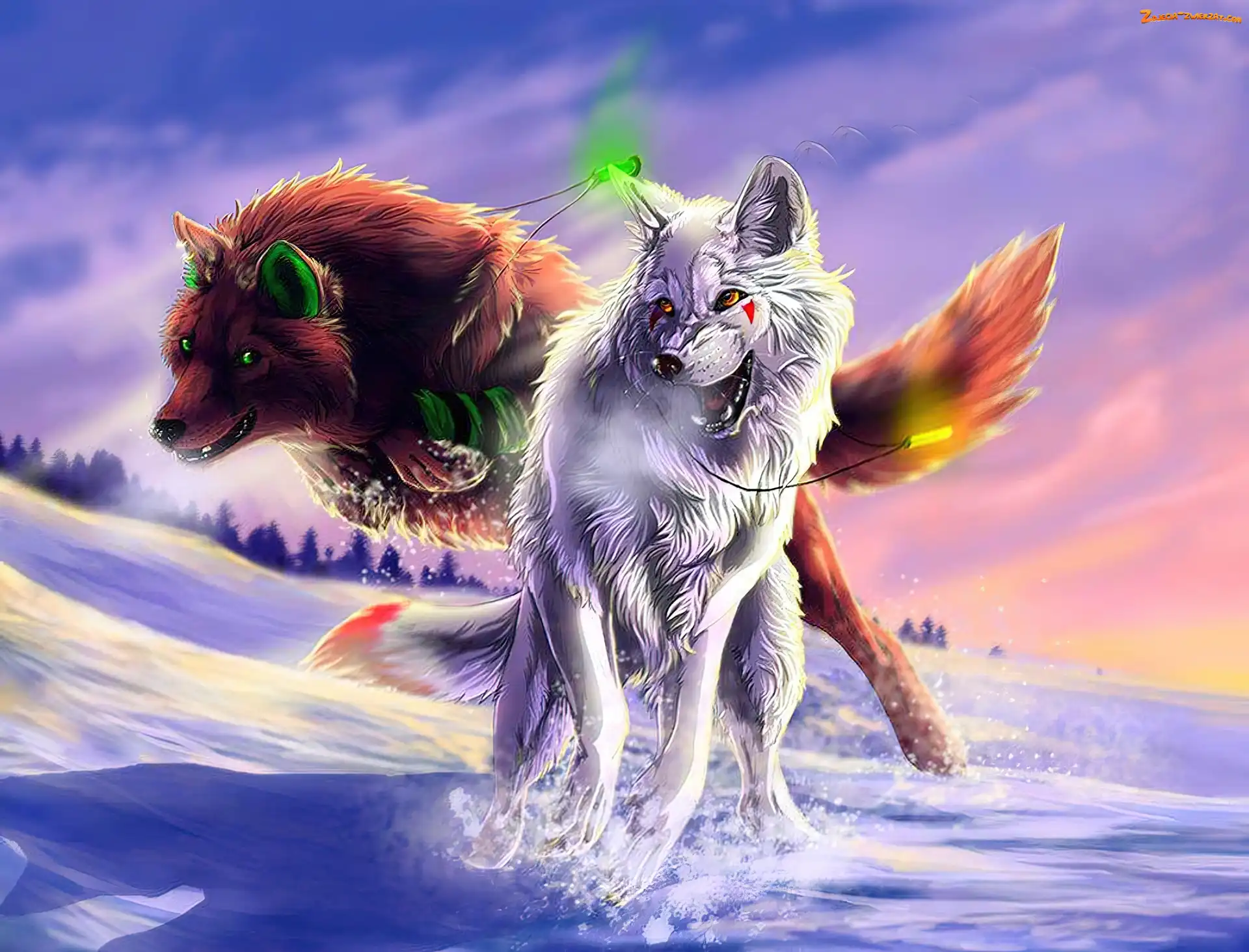 Zdjęcie: Fantasy, Słońca, Las, Wilki, Zachód