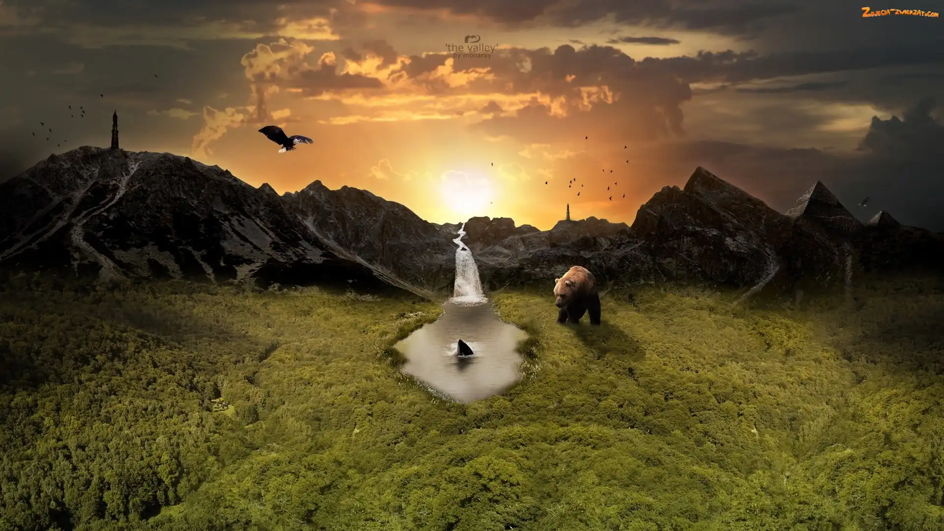 Zdjęcie: Fantasy, Góry, Ptak, Niedźwiedź, Zachód Słońca