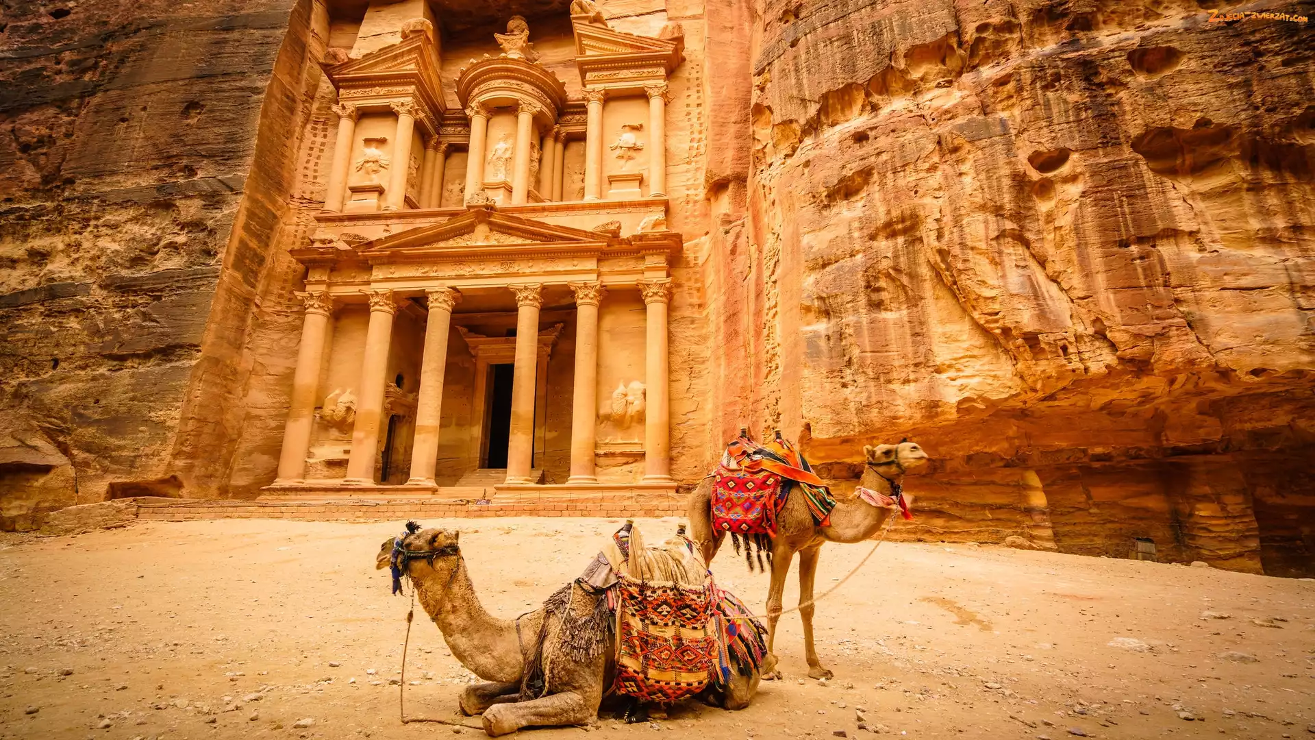 Zdjęcie: Wielbłądy, Skarbiec Faraona Al-Chazna, Jordania, Skały, Różowe Miasto, Petra, Ruiny