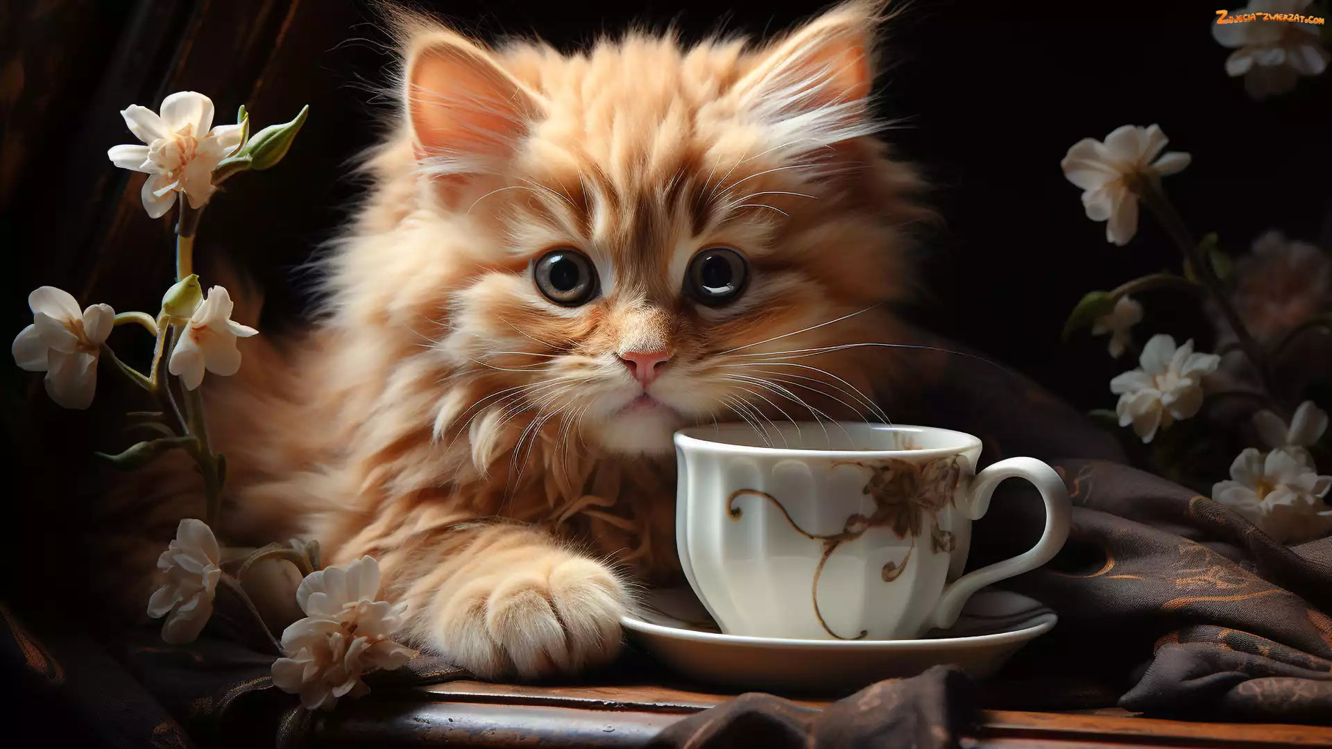 Zdjęcie: Talerzyk, Filiżanka, Kwiaty, Rudy, Kotek