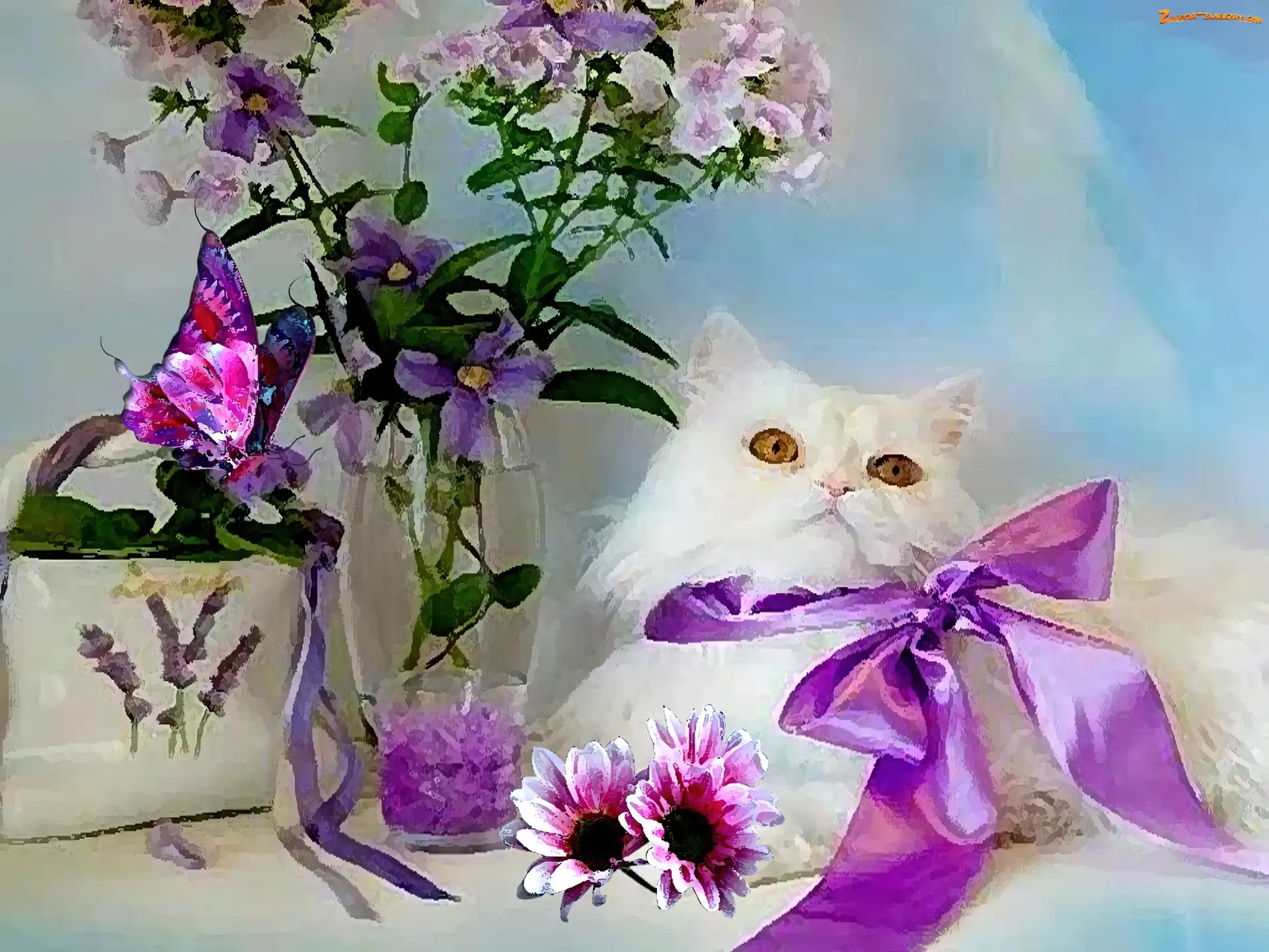 Zdjęcie: Fioletowa, Biały, Obraz, Kwiaty, Kot, Kokarda