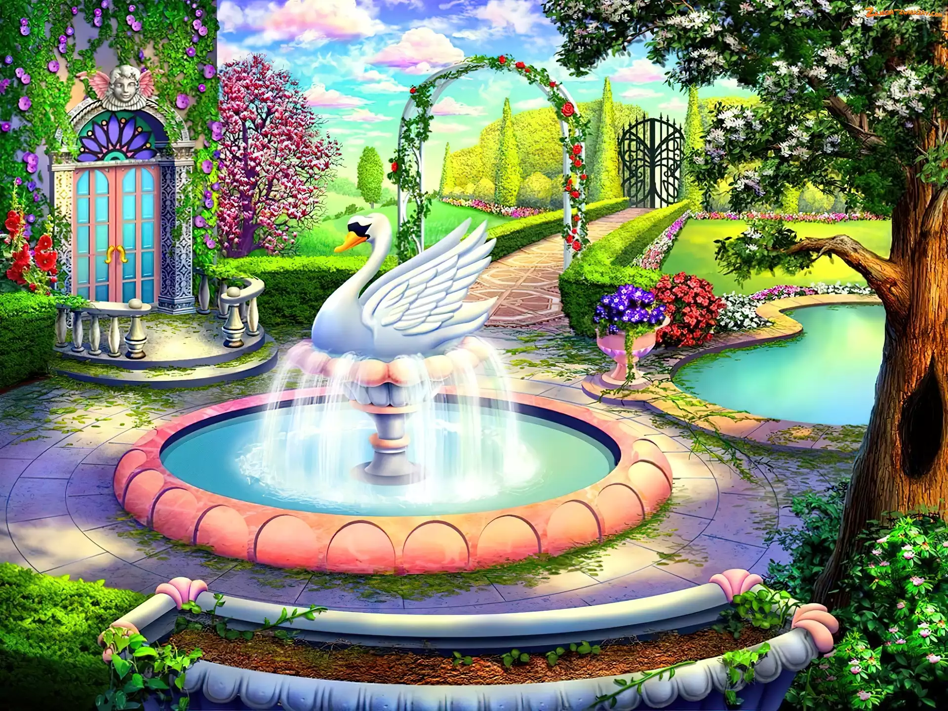 Zdjęcie: Łabędź, Ogród, Fontanna, Dom