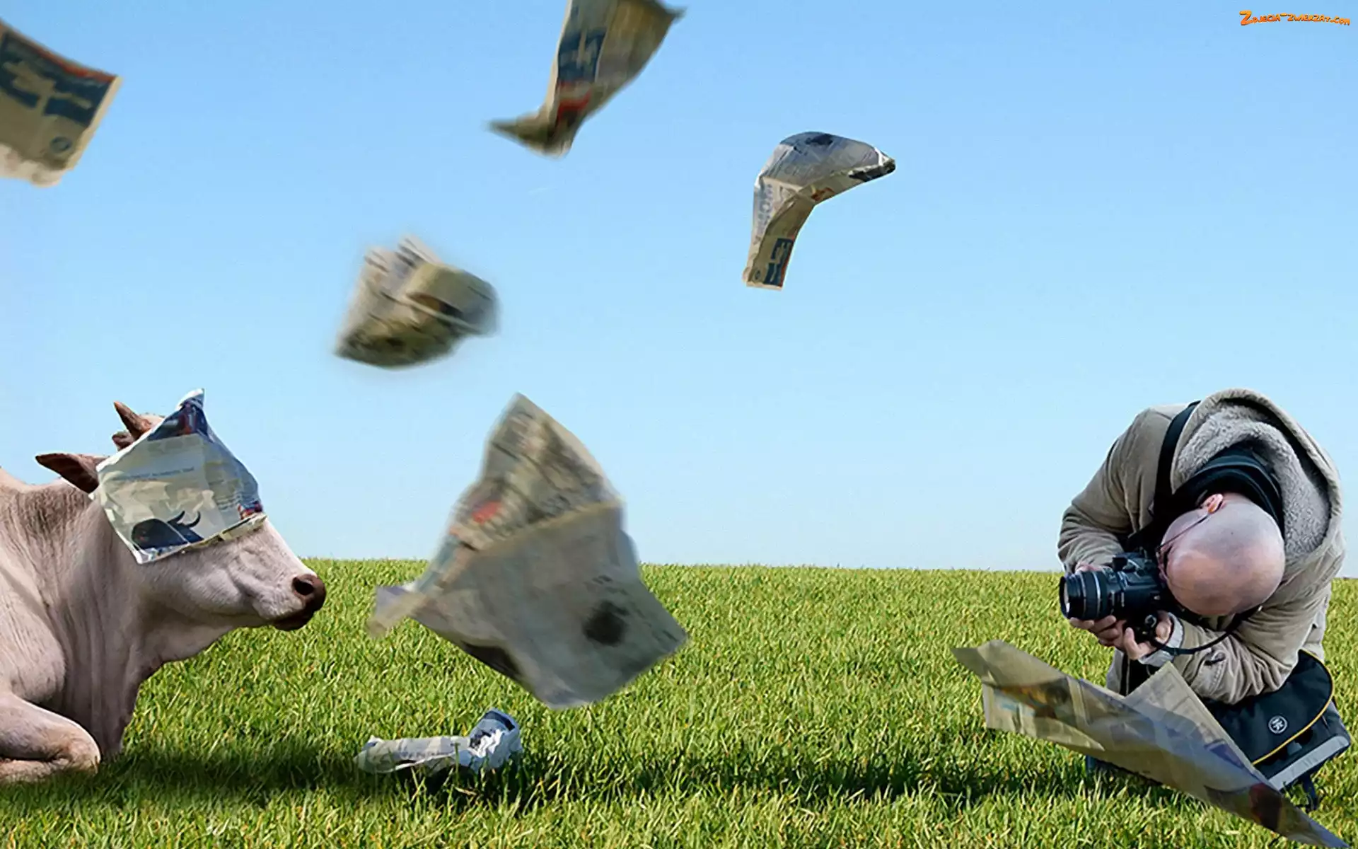 Zdjęcie: Fotograf, Gazety, Krowa, Trawa