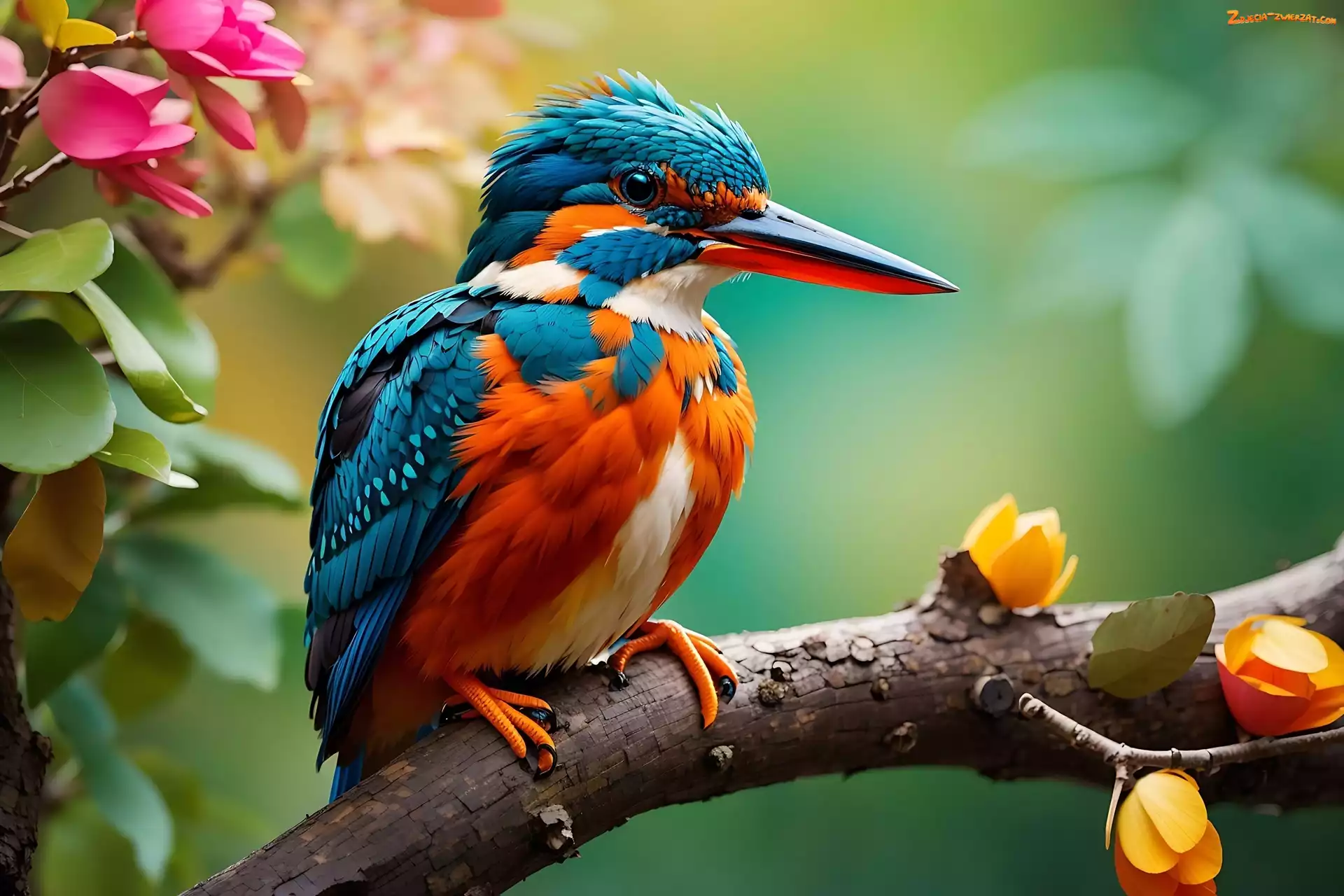 Zdjęcie: Kwiaty, Gałąź, Grafika, Zimorodek, Ptak