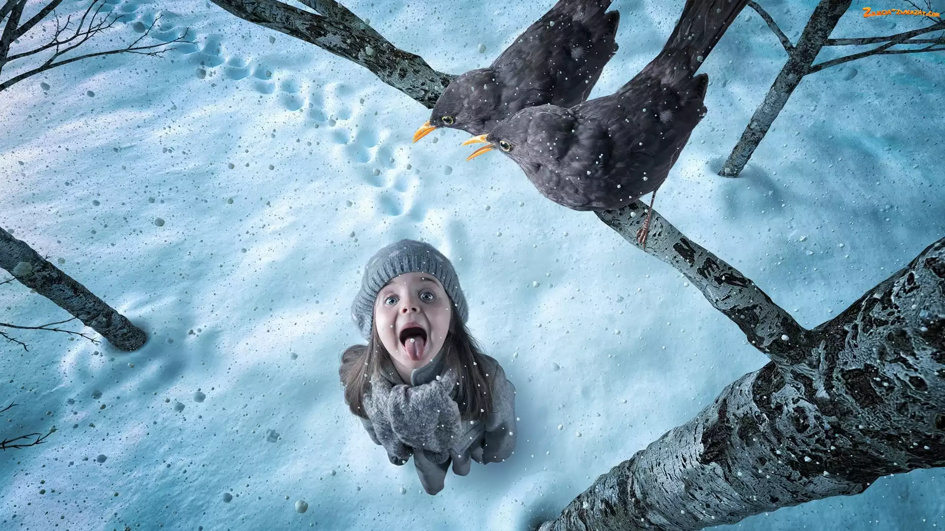 Zdjęcie: Gałąź, Ptaki, Śnieg, Zima, Kosy, Dziewczynka