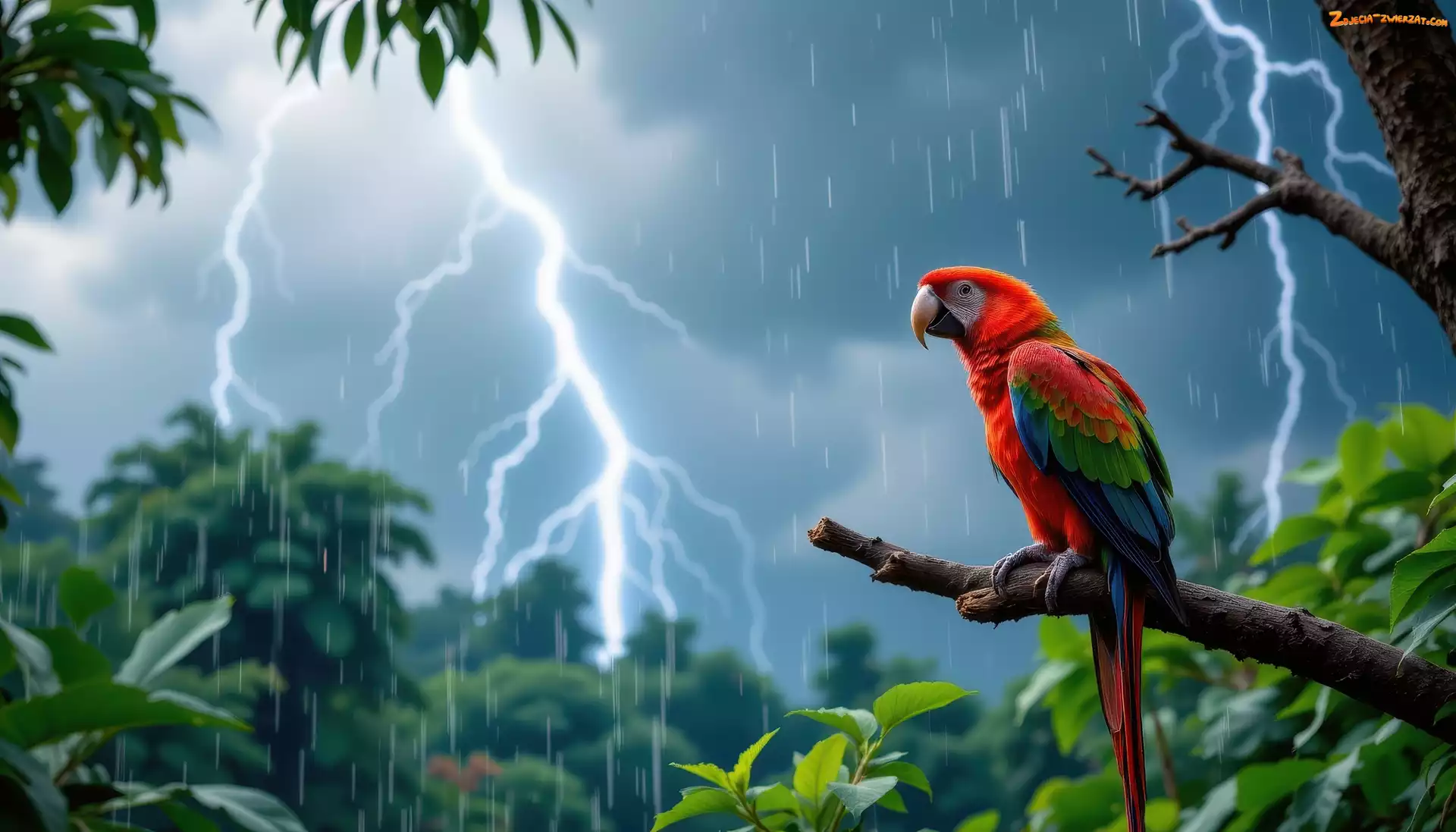 Deszcz, Gałąź, Pioruny, Papuga, Ara