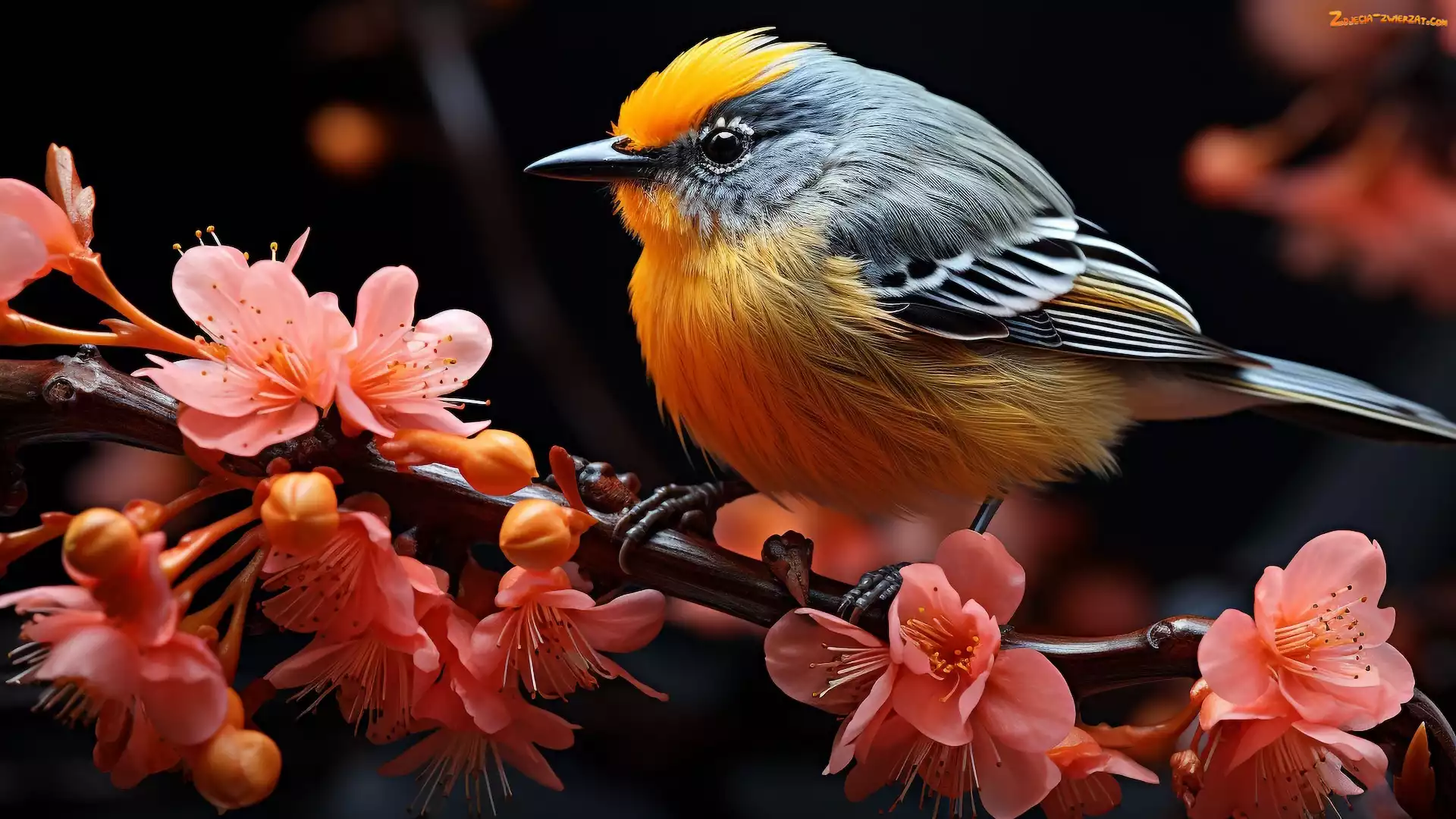 Zdjęcie: Ptak, Gałązka, Kwiaty, Drzewo owocowe